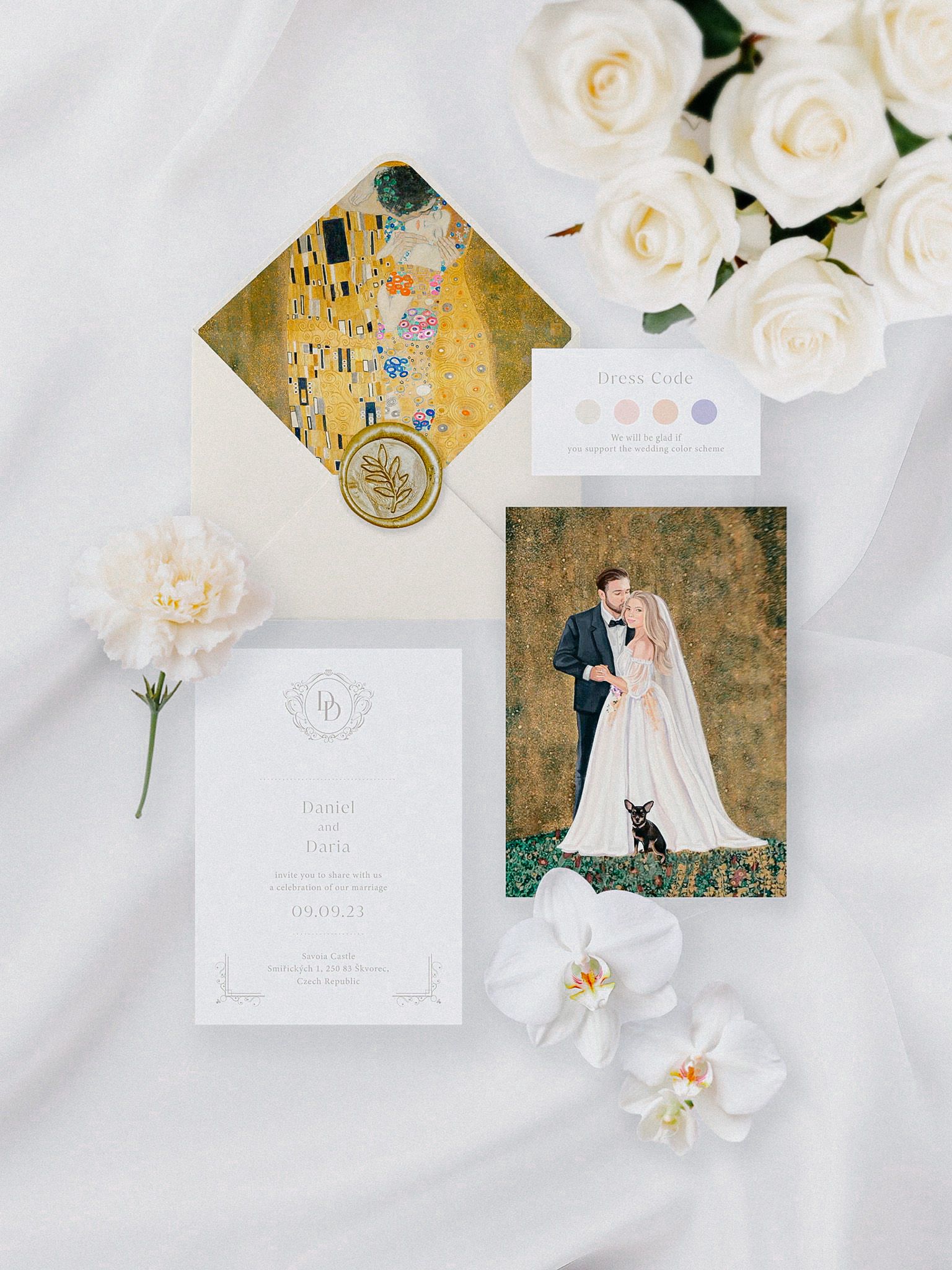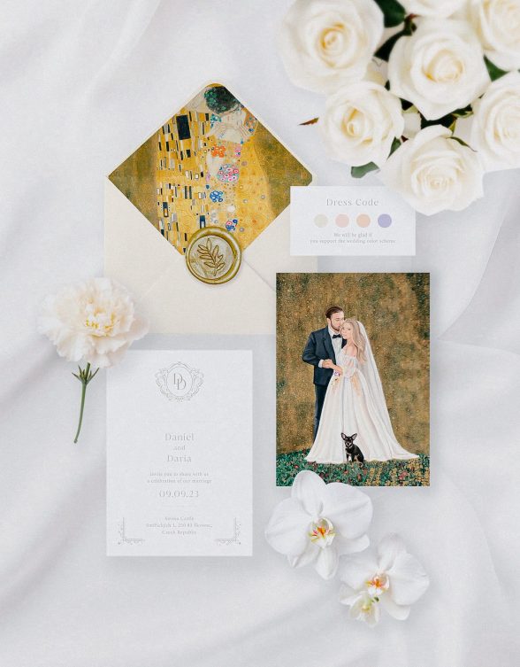Knowing the bride’s love for Gustav Klimt’s masterpiece “The Kiss,” we’ve decided to create watercolor portraits of Dasha and Daniel, which we used in various elements of the wedding decorations: invitations, menu, and guest wishes. s.