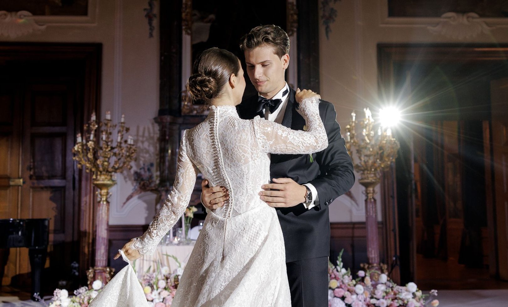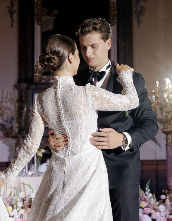 The interiors of the castle, crystal chandeliers, and candlelight transformed the evening into a vision of classic luxury. Their first dance beneath the golden chandelier felt like a scene from a film — slow, graceful, and deeply sincere.