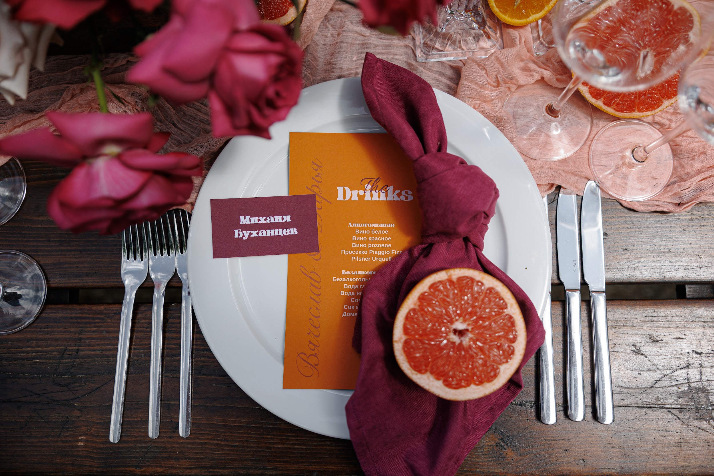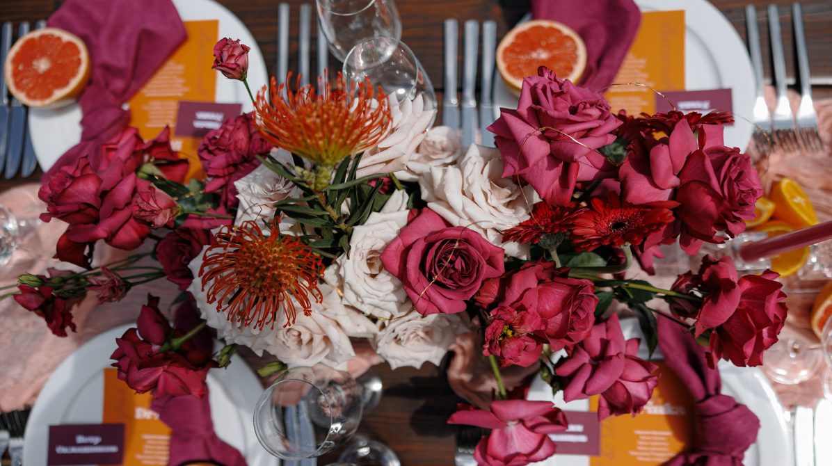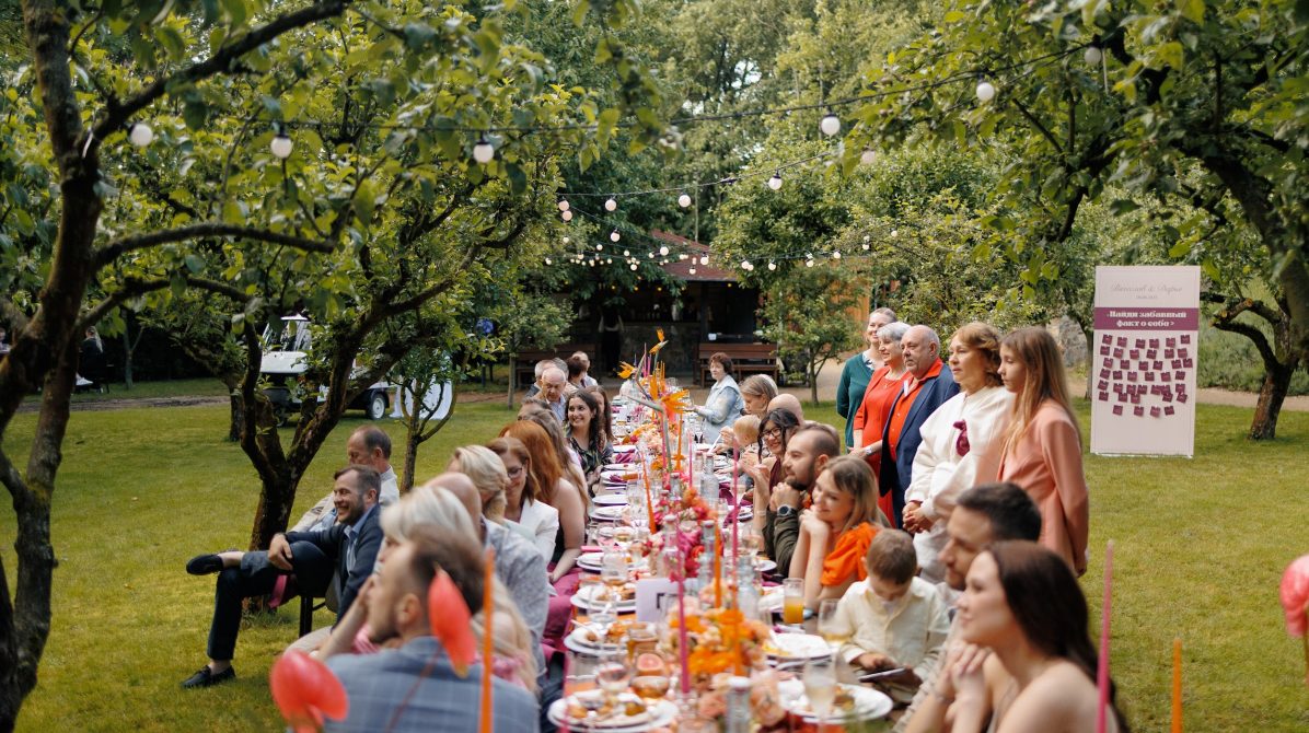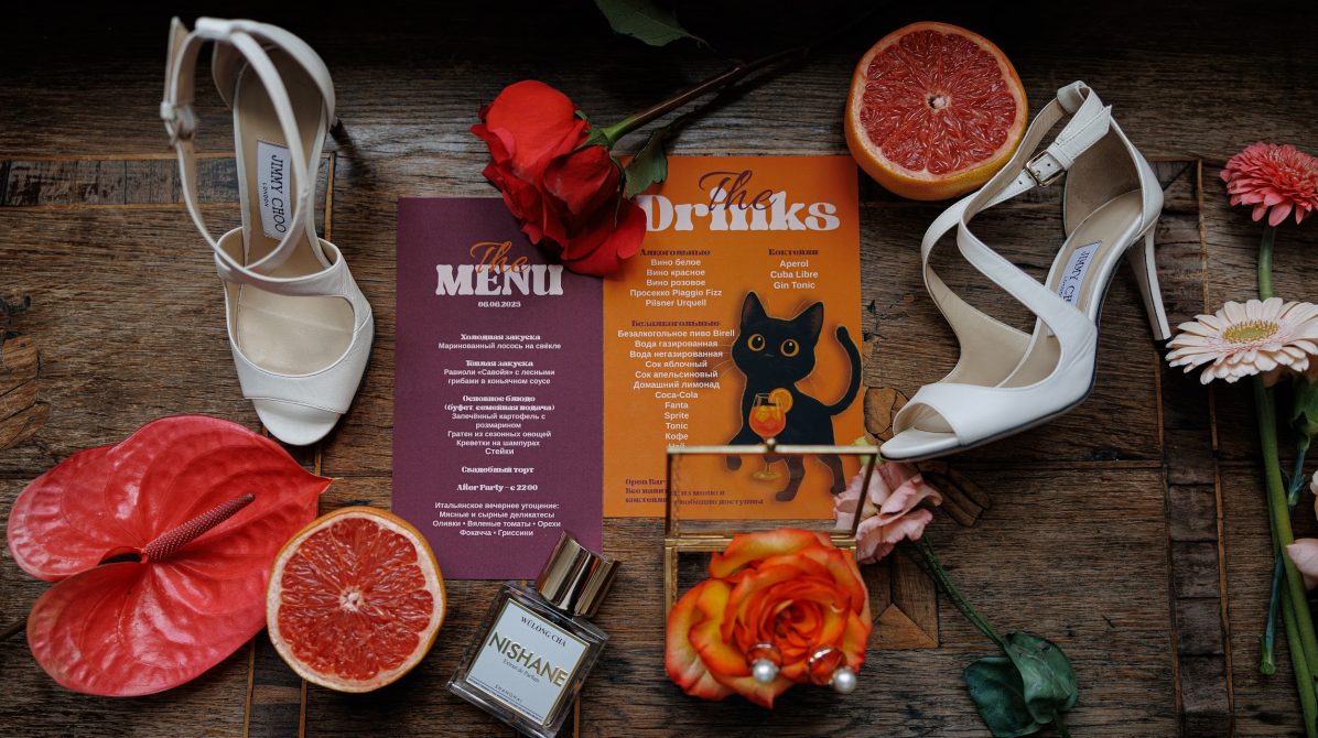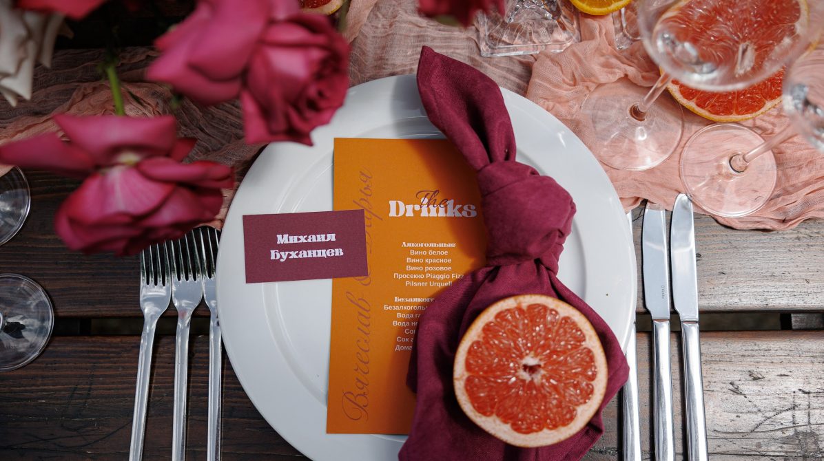 В основе этой свадьбы — лёгкость, яркость и искренность. Подготовка прошла почти невесомо: ребята с первых звонков были открыты к смелым решениям и полностью доверились процессу. Вместо привычной пастельной палитры мы выбрали насыщенные цвета, добавили в декор грейпфруты и сделали ставку на живость, летнее настроение и энергию праздника.