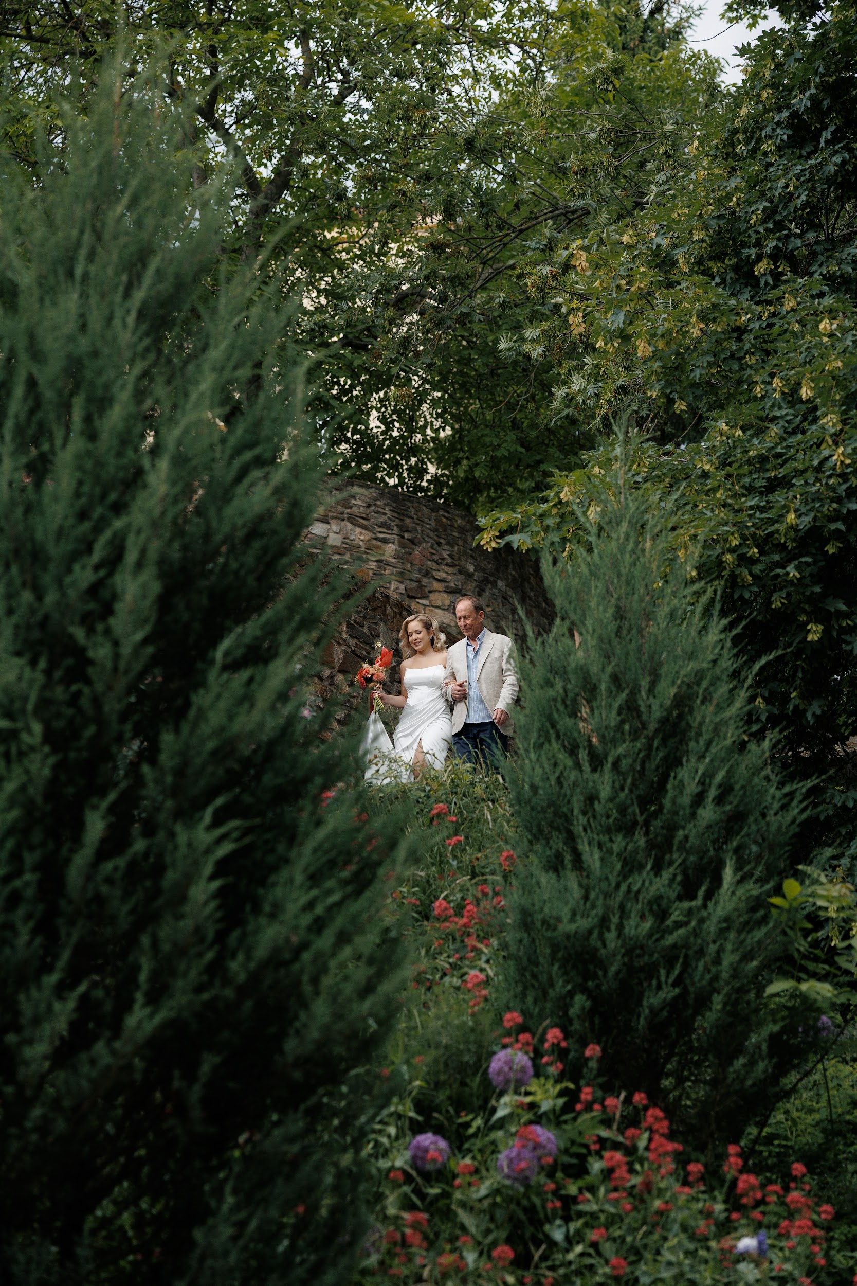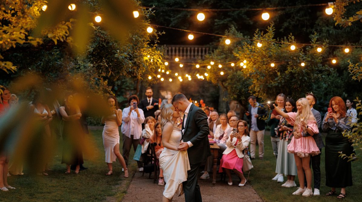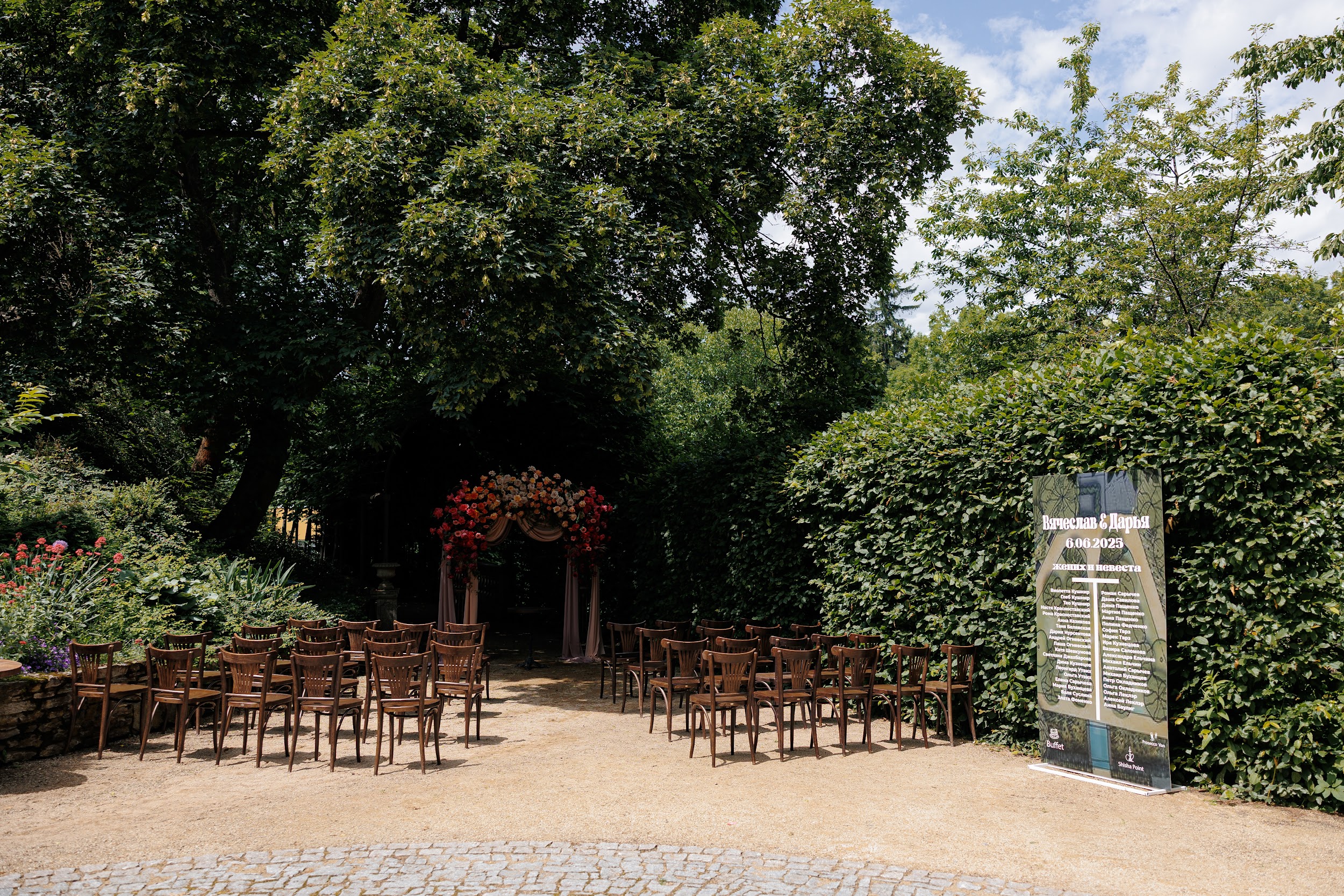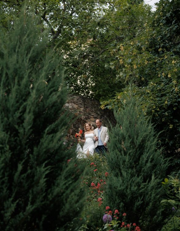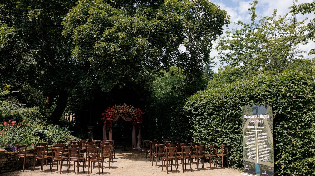 Церемония и банкет проходили в саду замка Savoia — месте, где история встречается с природой. В день свадьбы небо неожиданно разразилось ливнем, но даже дождь не смог помешать торжеству. Всё сложилось как будто по волшебству: к началу церемонии небо прояснилось, и праздник продолжился в тёплой атмосфере лета.
