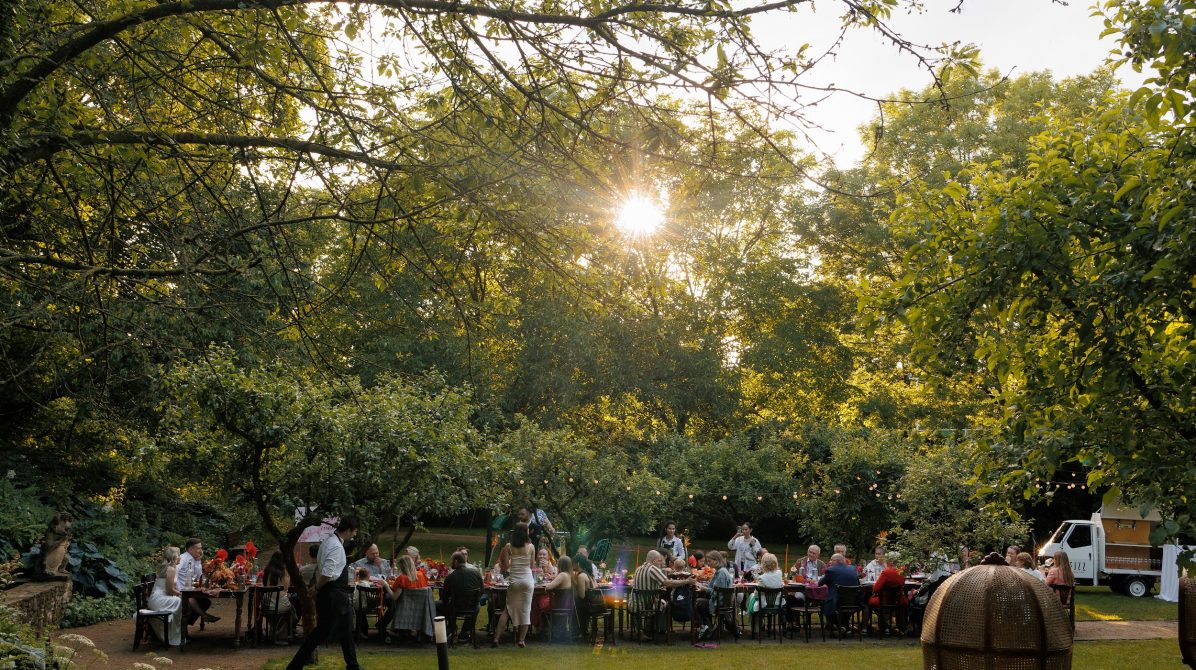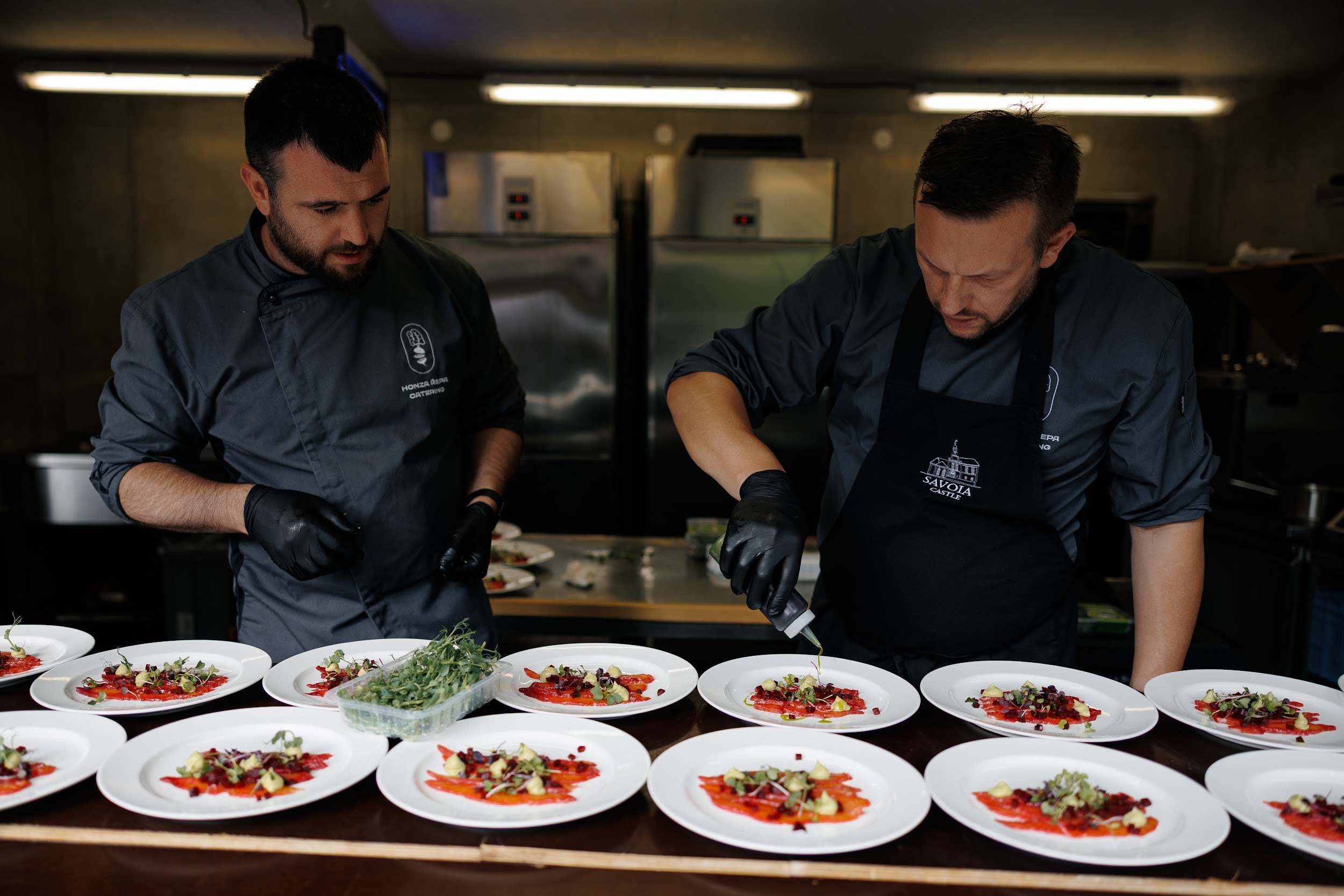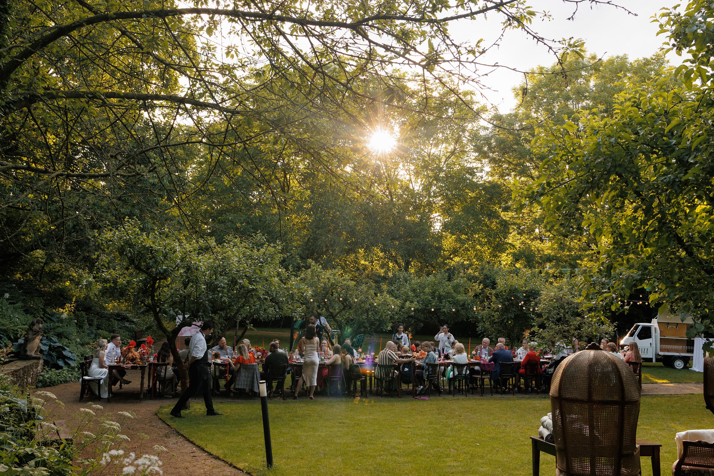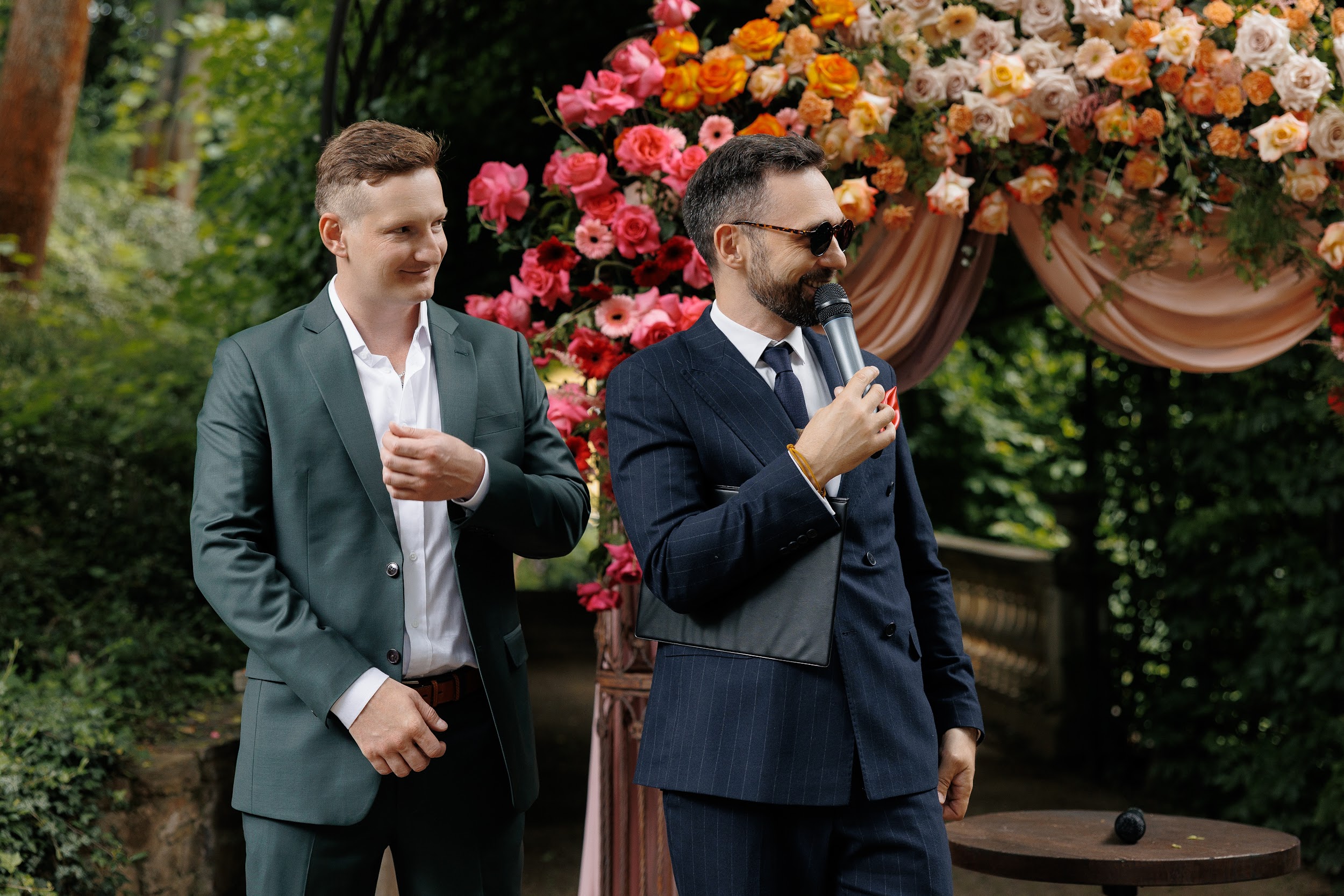 Церемония и банкет проходили в саду замка Savoia — месте, где история встречается с природой. В день свадьбы небо неожиданно разразилось ливнем, но даже дождь не смог помешать торжеству. Всё сложилось как будто по волшебству: к началу церемонии небо прояснилось, и праздник продолжился в тёплой атмосфере лета.