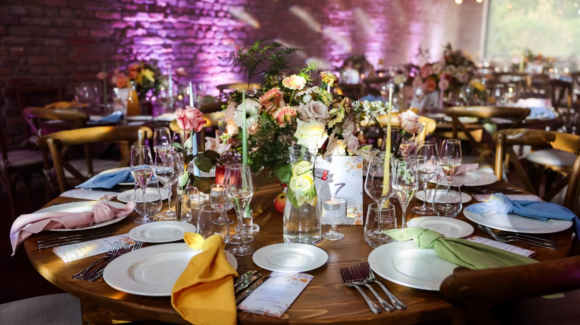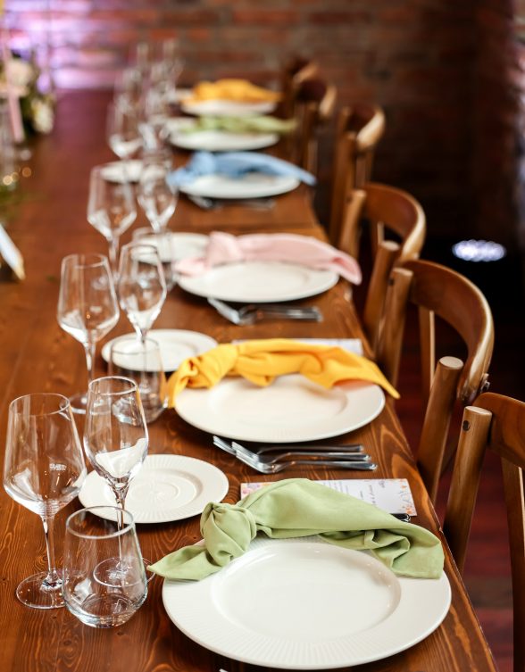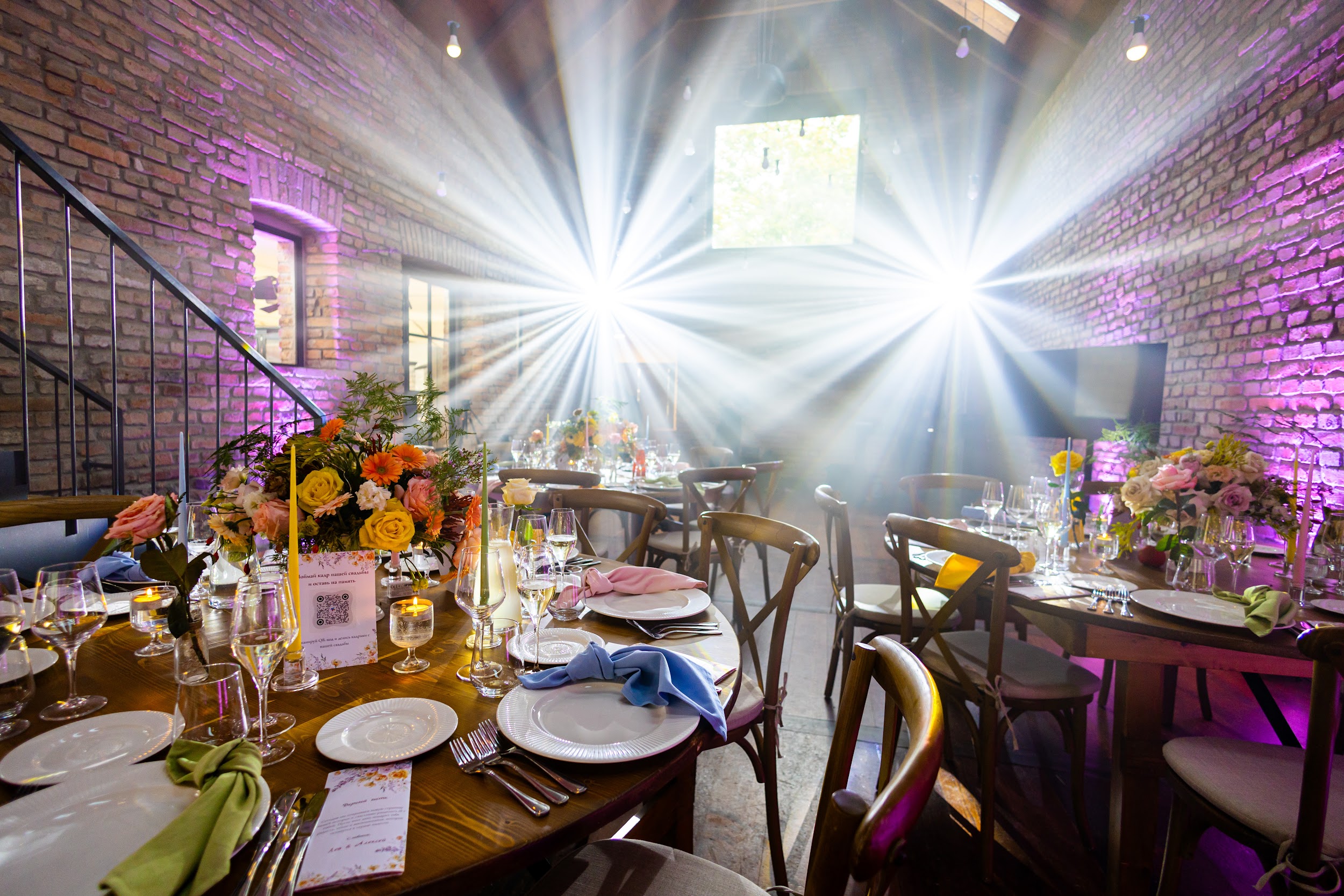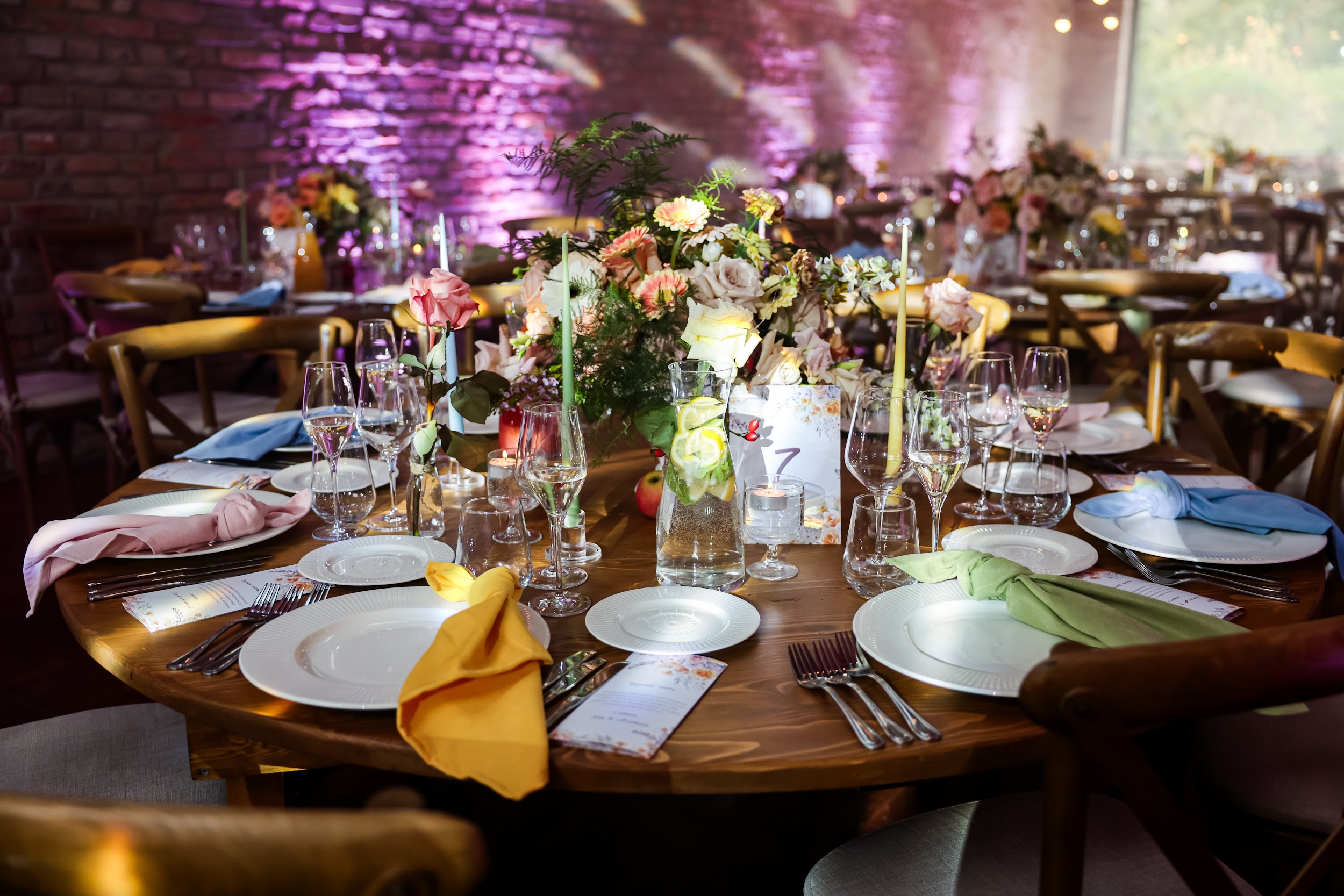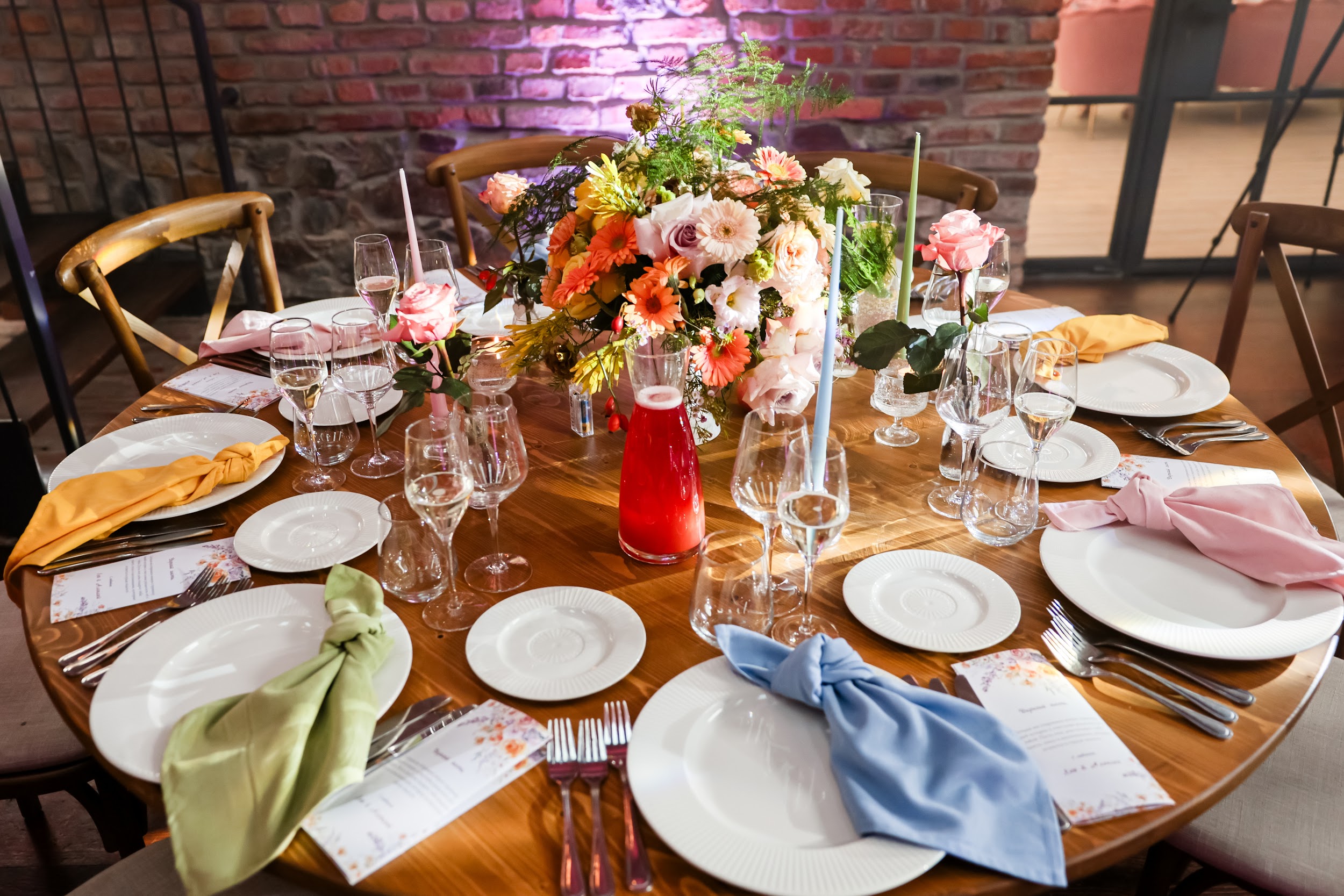 Основой оформления стала идея яркой свадебной концепции с акцентом на цвет, лёгкость и современную эстетику. Декор строился на сочетании насыщенных и пастельных оттенков: цветные салфетки, живая флористика с акцентами жёлтого, розового и зелёного, тёплый свет и натуральные материалы. Пространство выглядело живым, динамичным и при этом гармоничным — идеальное решение для современной свадьбы в Чехии. Каждая деталь — от сервировки до композиции столов — была частью единого визуального сценария.