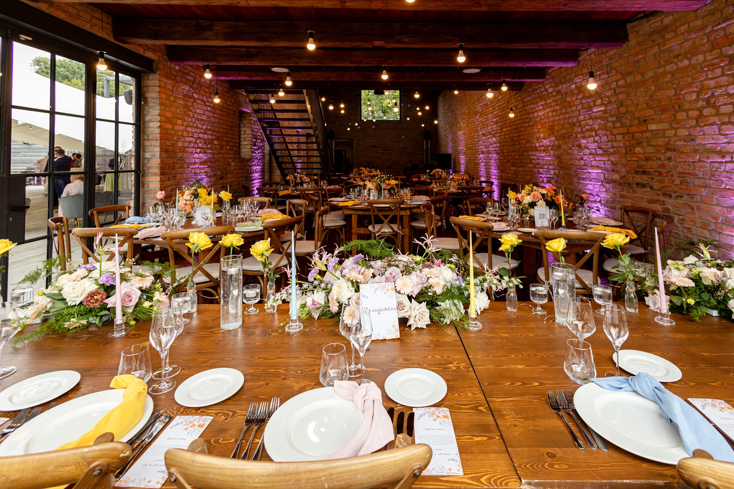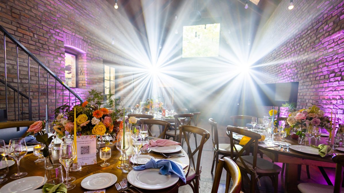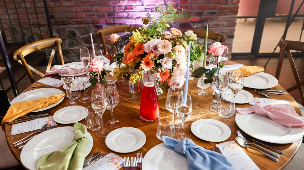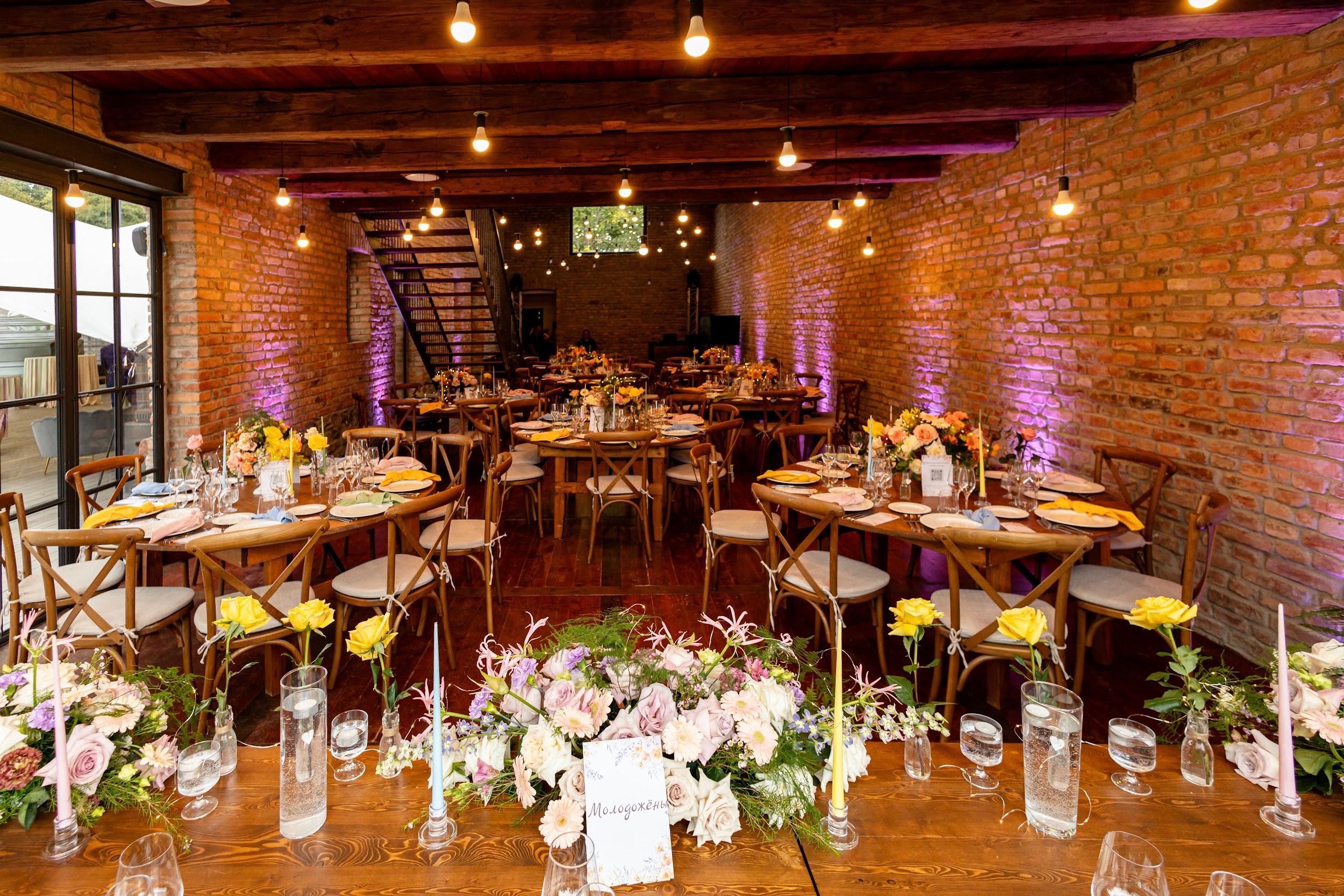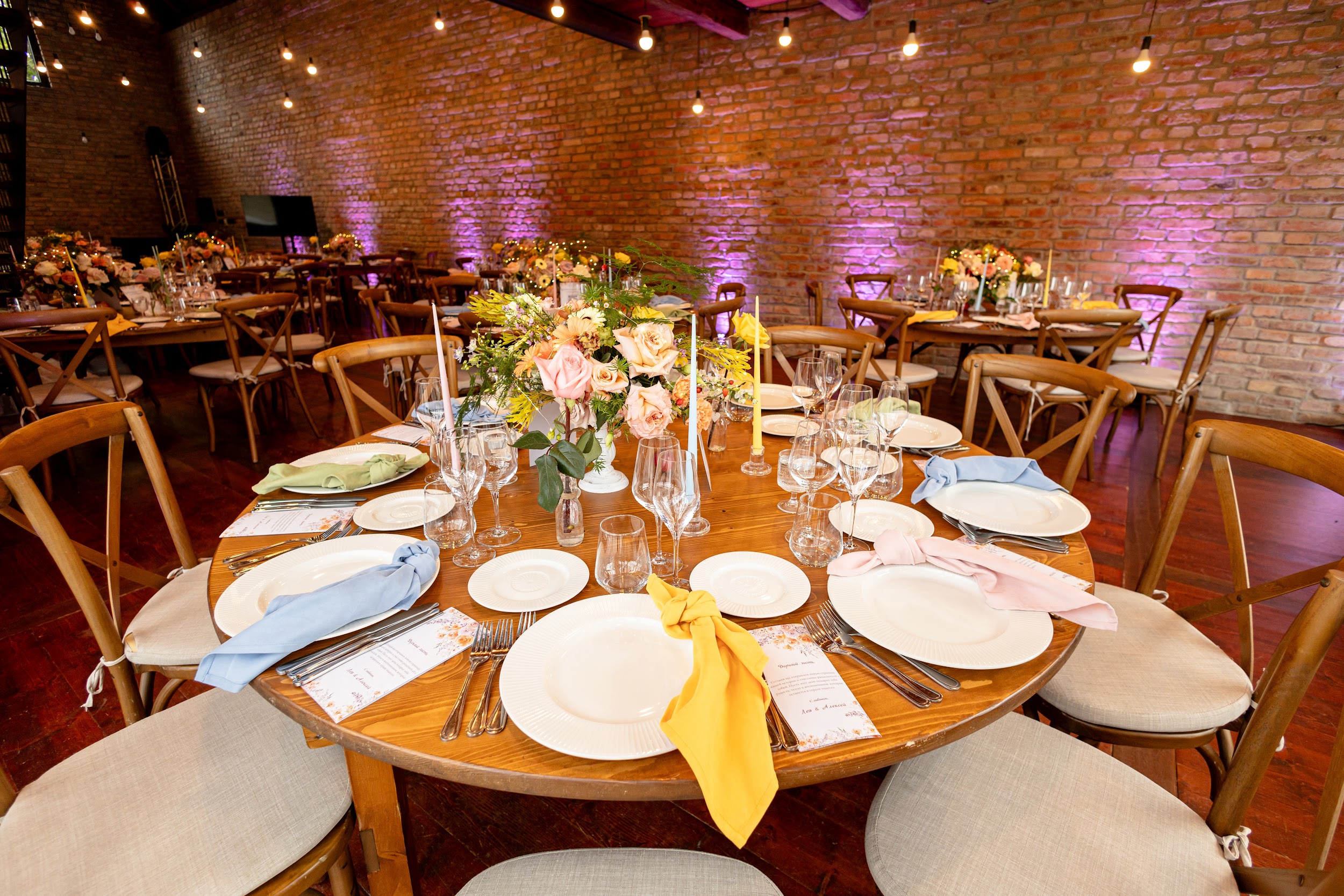 Основой оформления стала идея яркой свадебной концепции с акцентом на цвет, лёгкость и современную эстетику. Декор строился на сочетании насыщенных и пастельных оттенков: цветные салфетки, живая флористика с акцентами жёлтого, розового и зелёного, тёплый свет и натуральные материалы. Пространство выглядело живым, динамичным и при этом гармоничным — идеальное решение для современной свадьбы в Чехии. Каждая деталь — от сервировки до композиции столов — была частью единого визуального сценария.