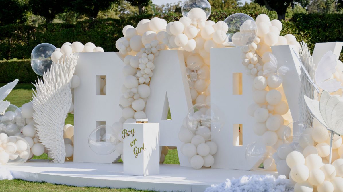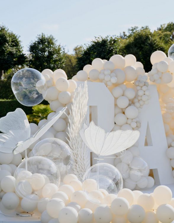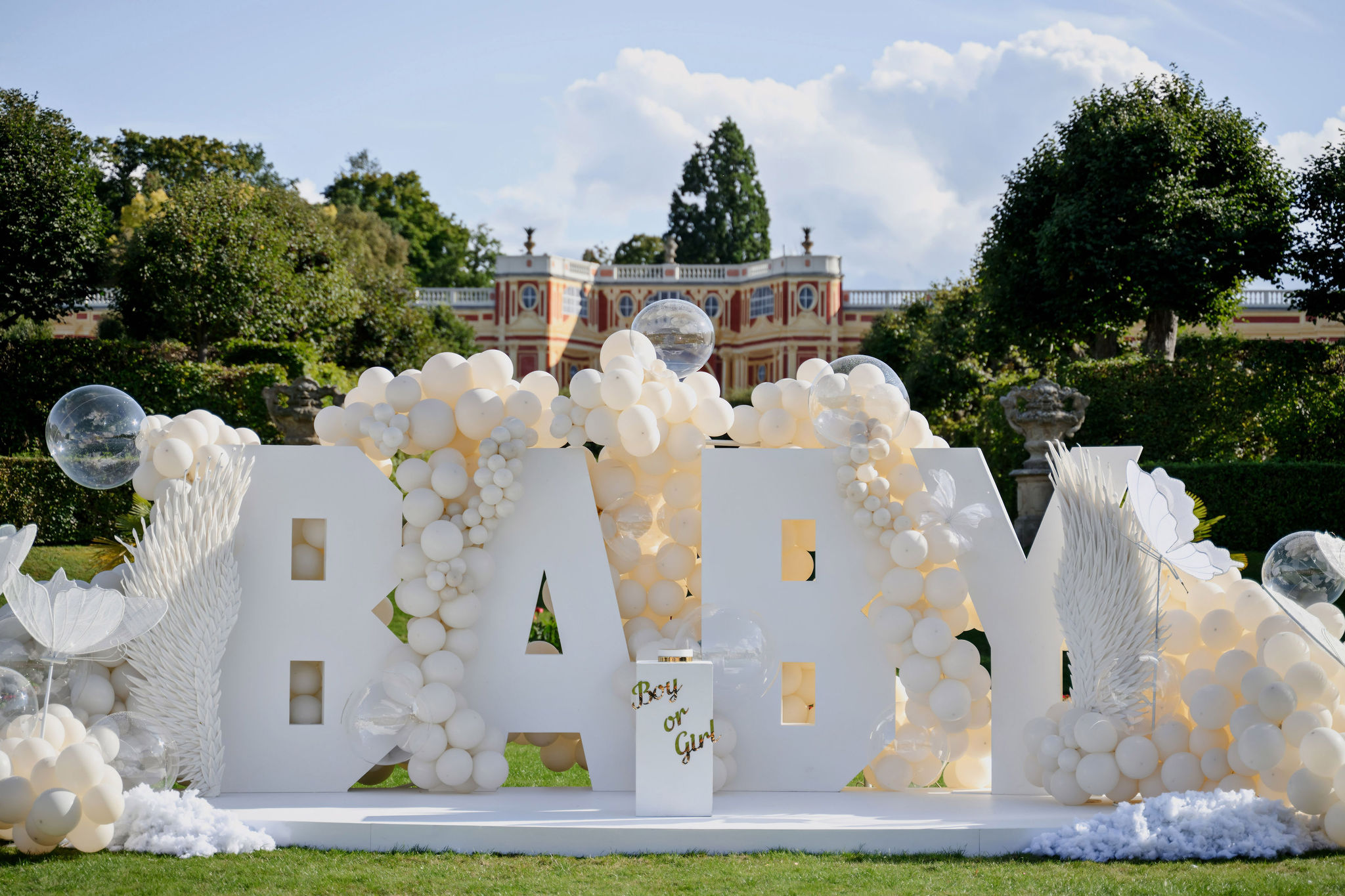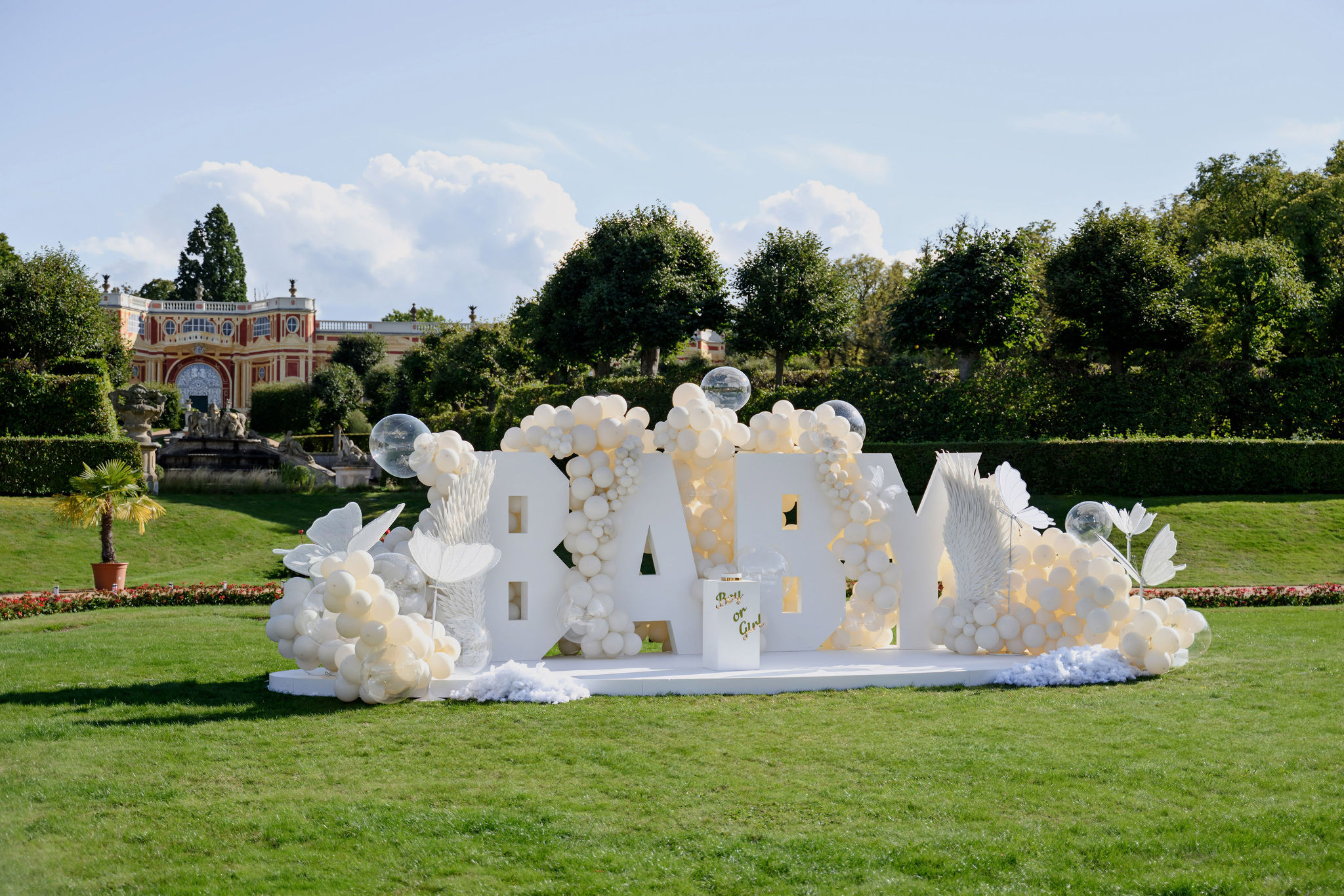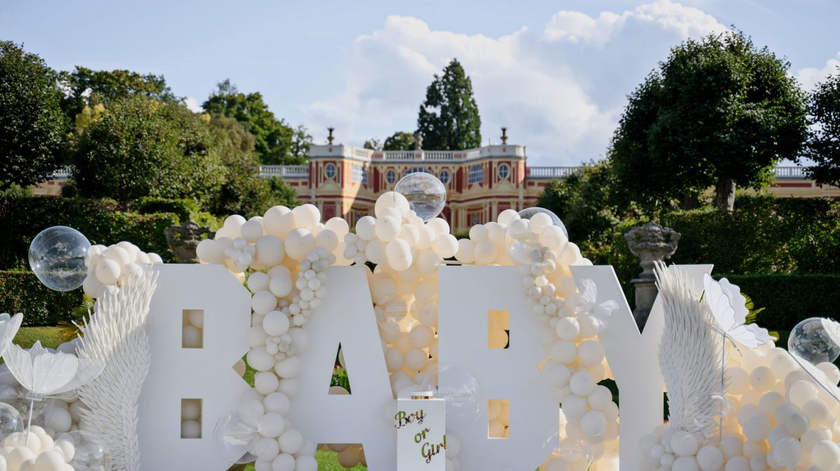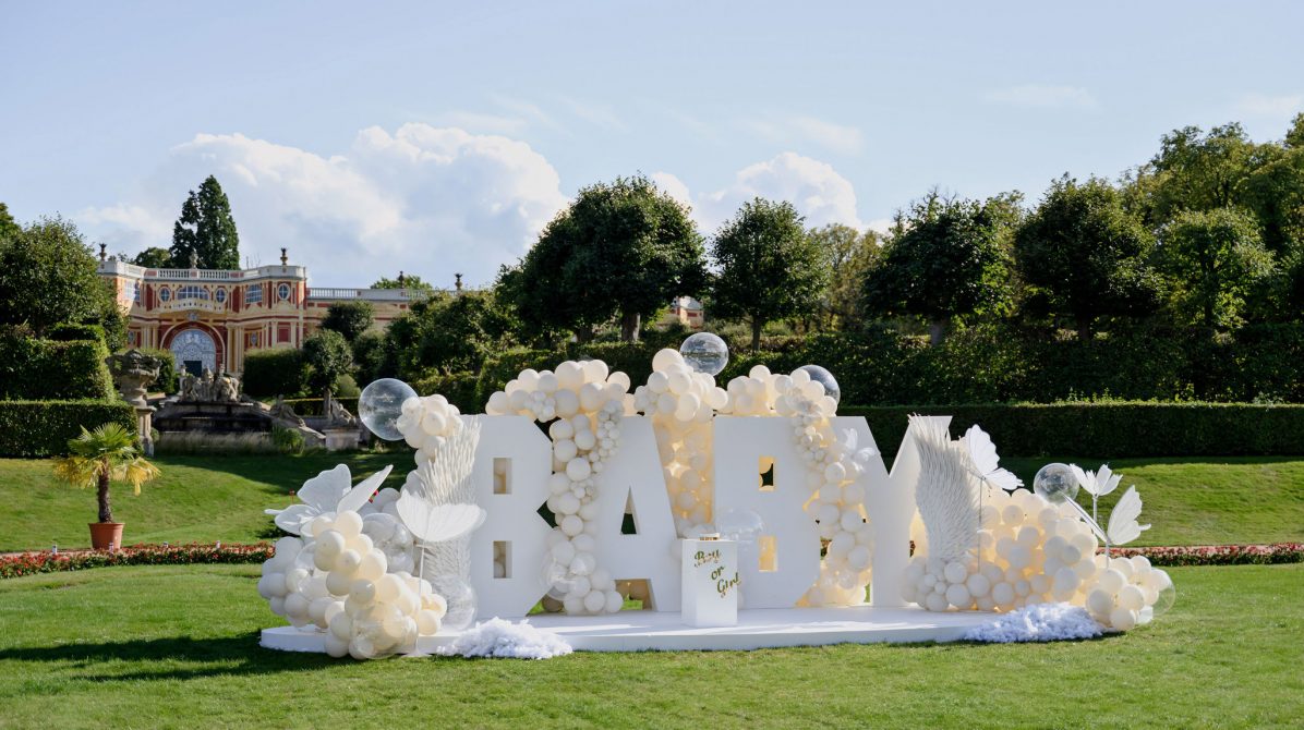 Концепция была построена вокруг минимализма и визуальной чистоты. Центральным элементом стала дизайнерская инсталляция с надписью BABY, дополненная воздушным декором в светлой гамме, прозрачными шарами и мягкими текстурами. Такое оформление идеально вписывается в формат luxury event в Чехии и подходит для проведения мероприятий в замках и садах, включая Dobříš