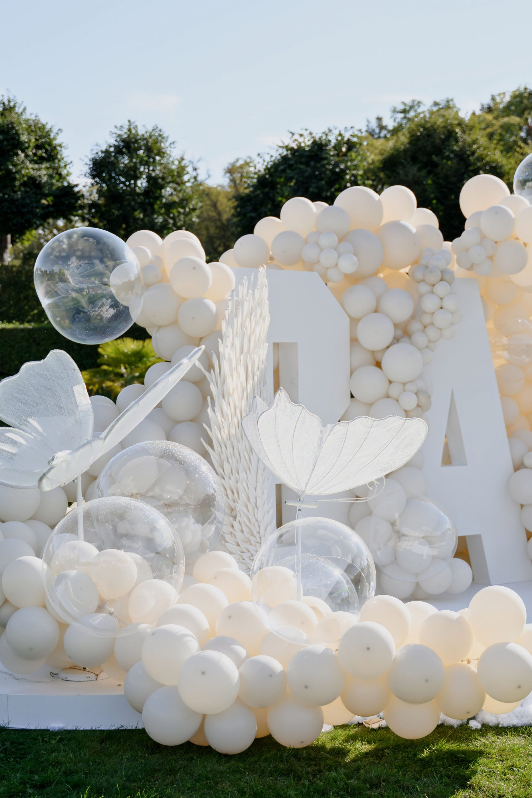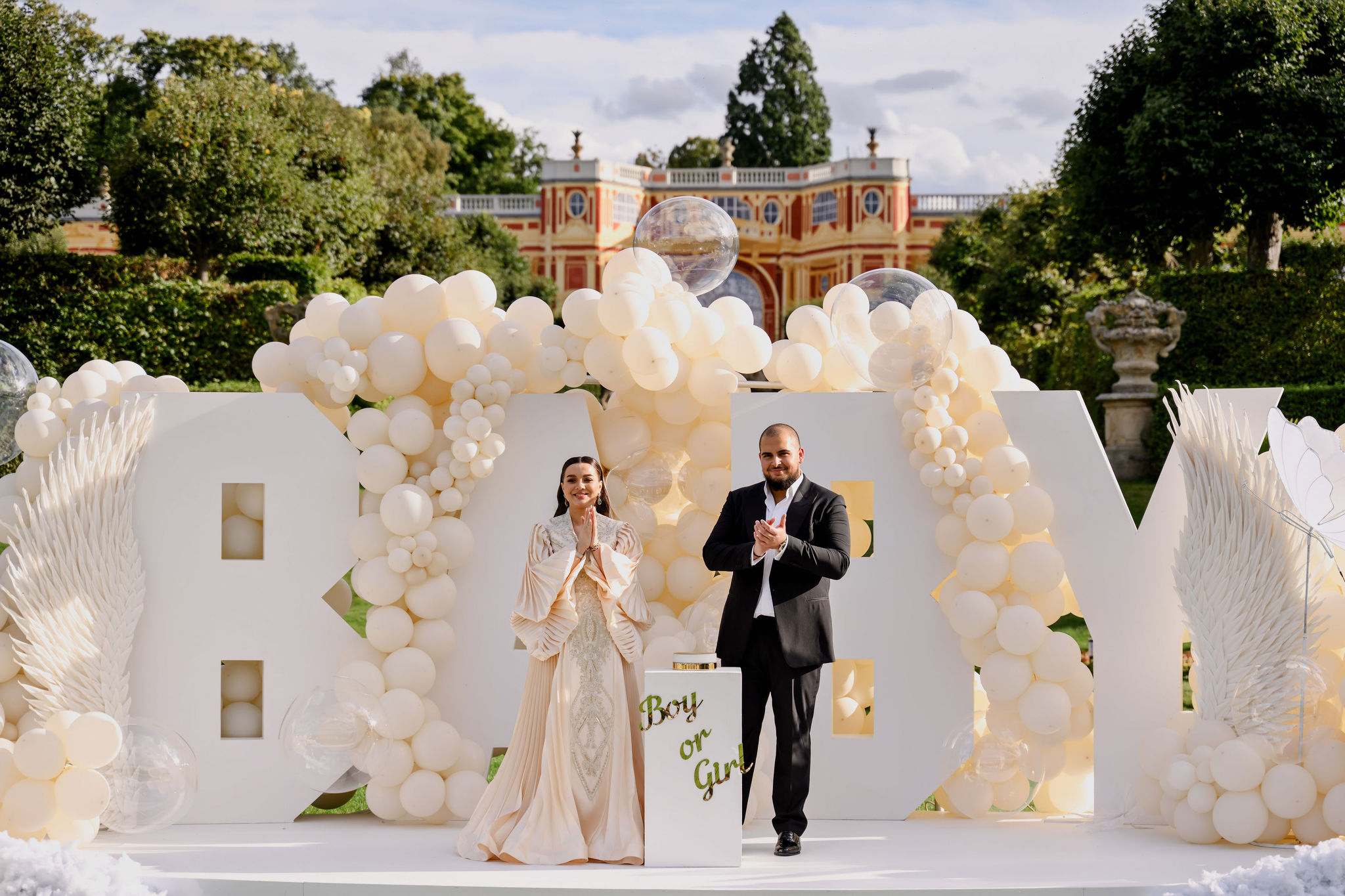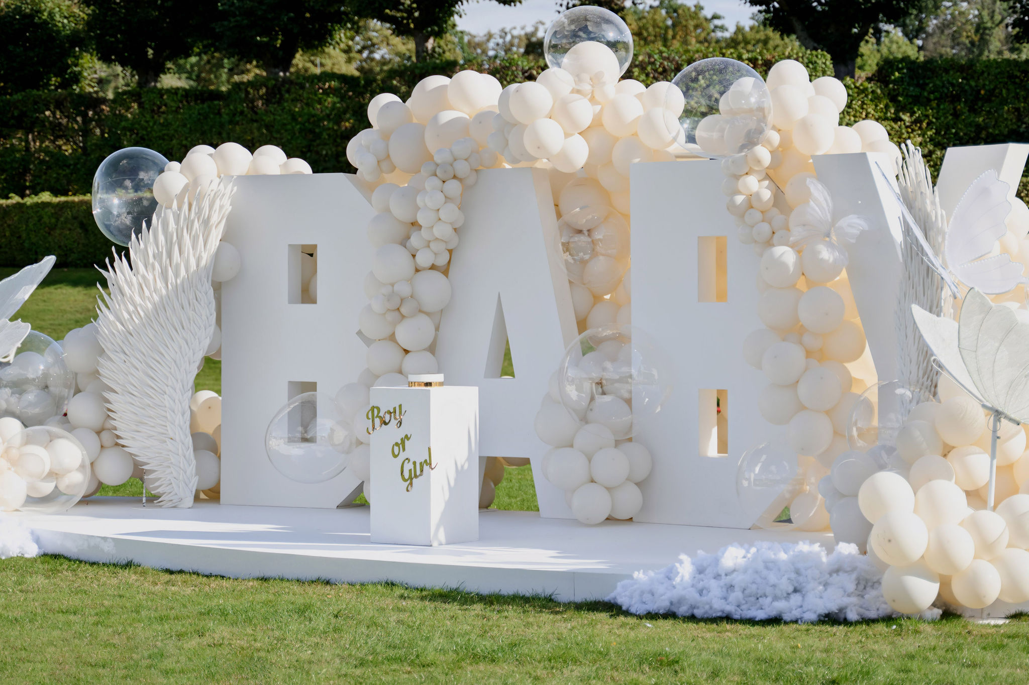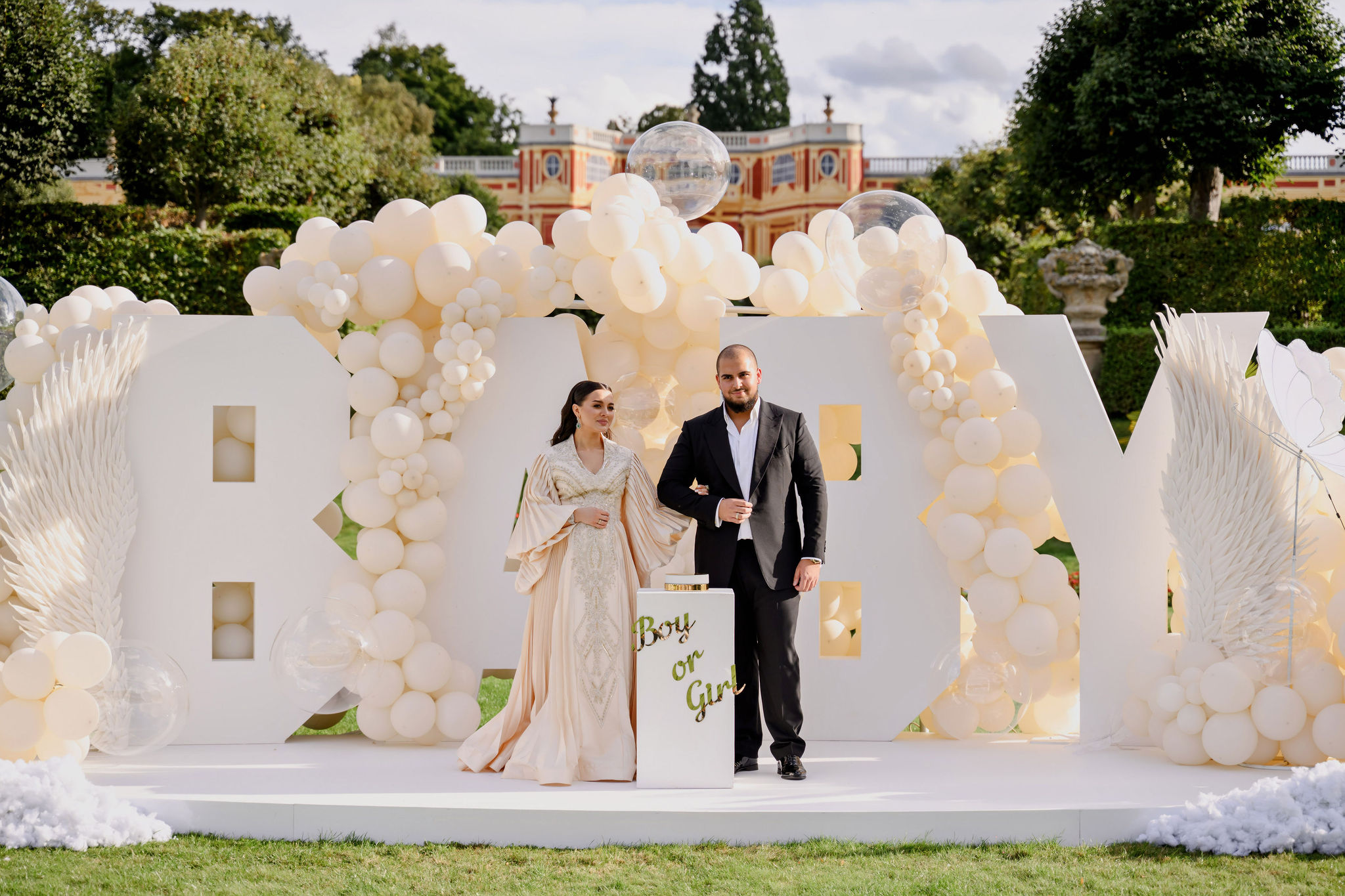 Концепция была построена вокруг минимализма и визуальной чистоты. Центральным элементом стала дизайнерская инсталляция с надписью BABY, дополненная воздушным декором в светлой гамме, прозрачными шарами и мягкими текстурами. Такое оформление идеально вписывается в формат luxury event в Чехии и подходит для проведения мероприятий в замках и садах, включая Dobříš