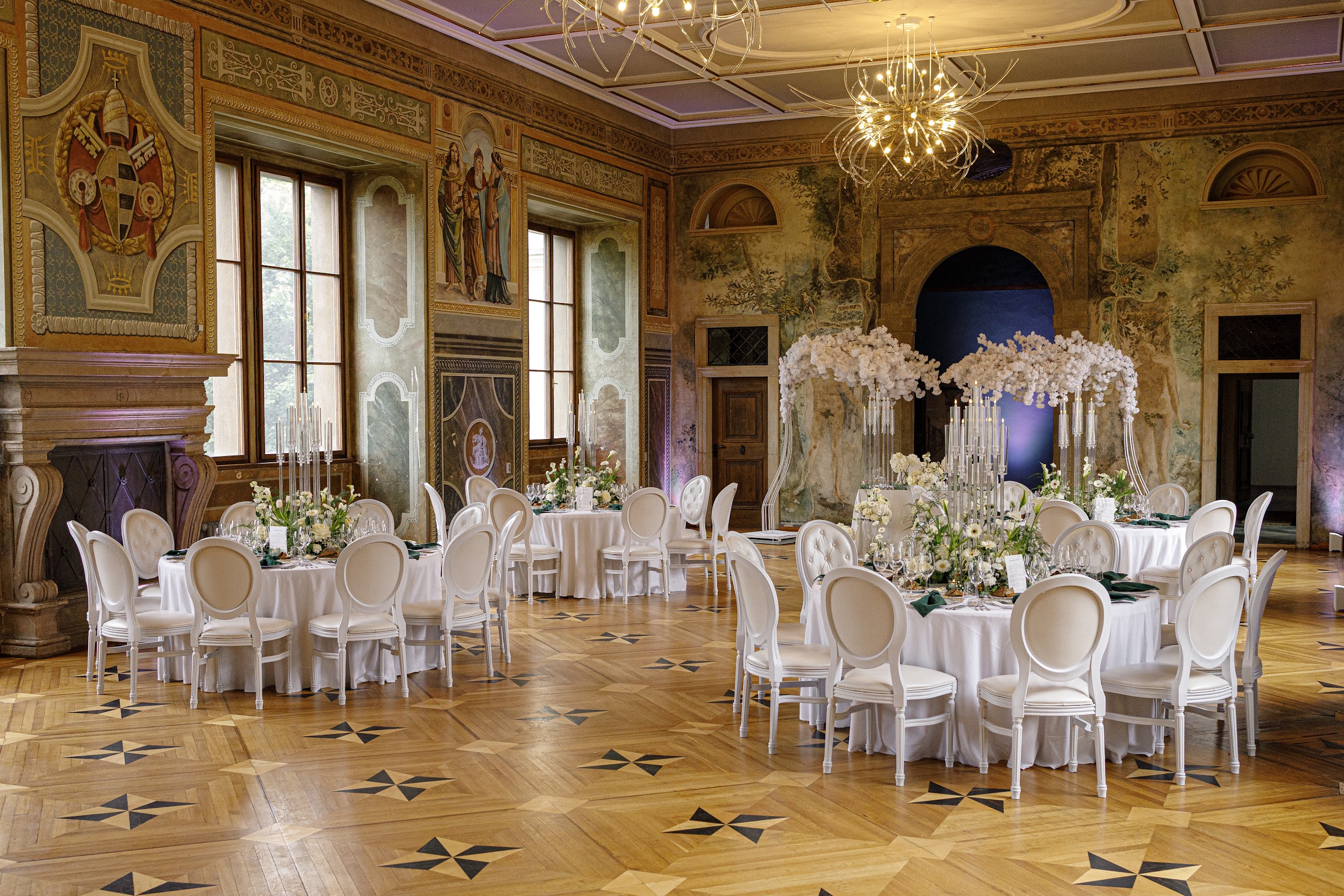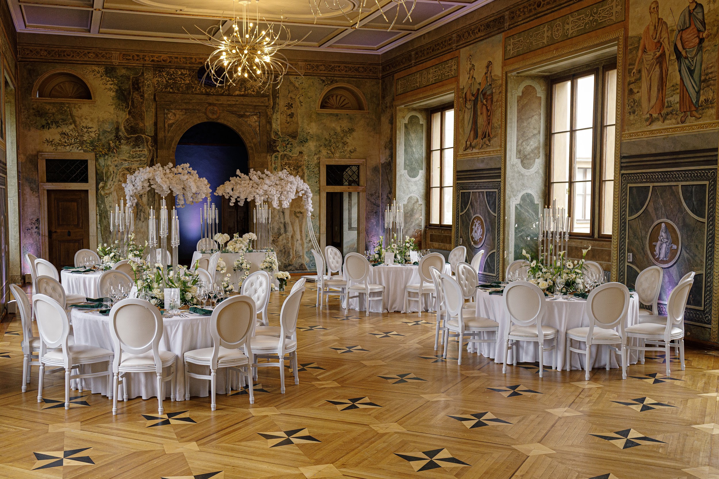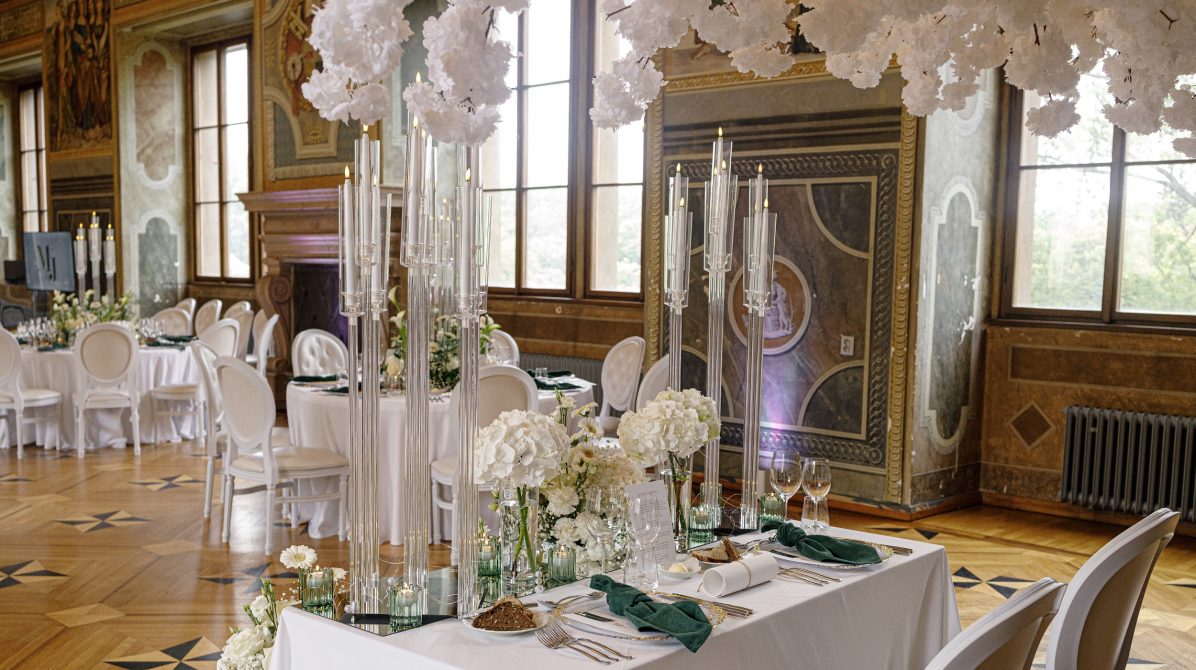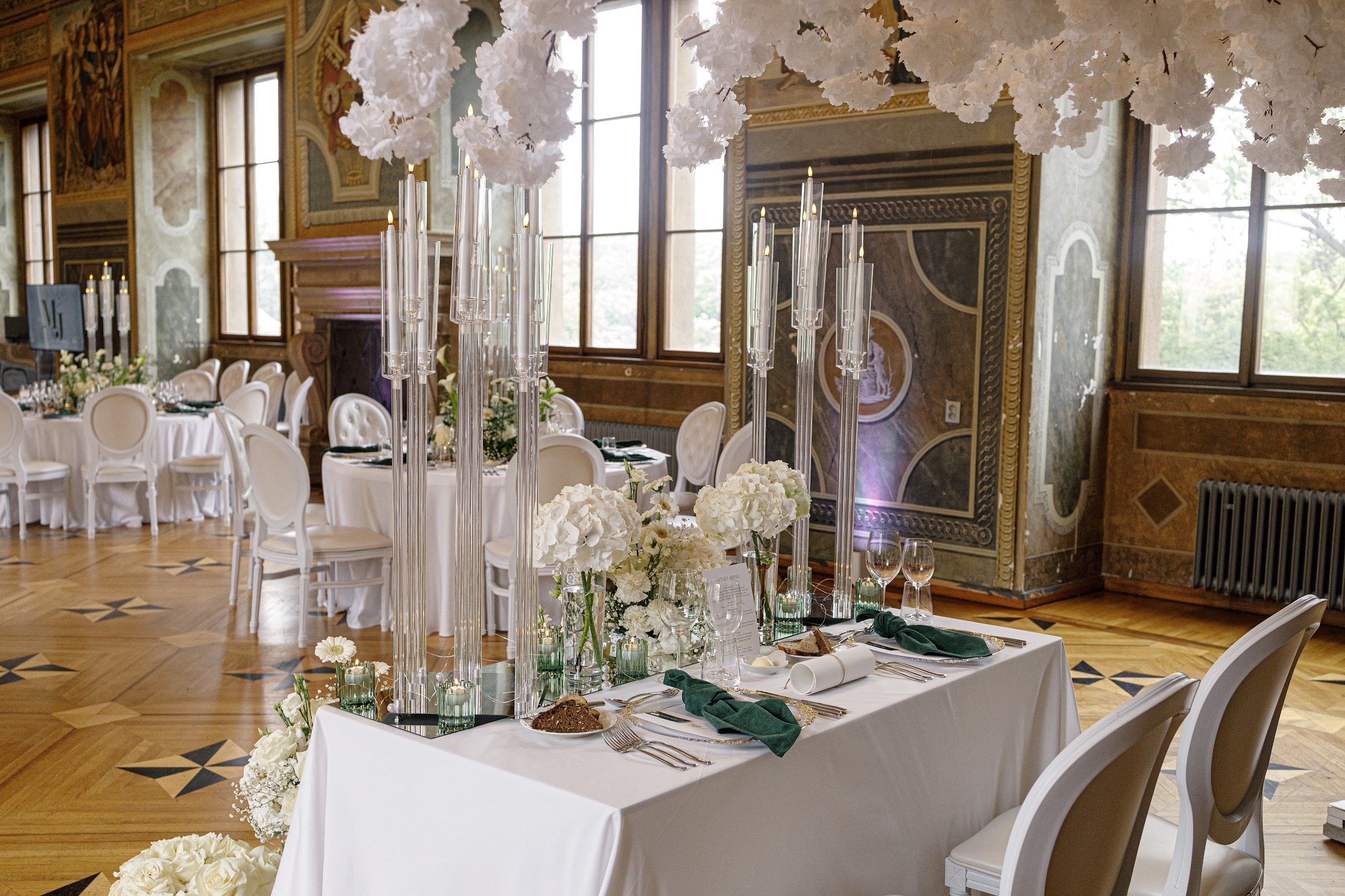 Контрастом к природной лёгкости церемонии стал банкет в Martinickém paláci — дворце с богатой историей, расписными стенами и высокими потолками. Его залы словно созданы для праздничных вечеров: изысканные фрески, тёплое освещение и ощущение, будто время замедляется. Здесь современный декор в бело-зелёной палитре и стеклянные элементы органично переплелись с архитектурным величием.