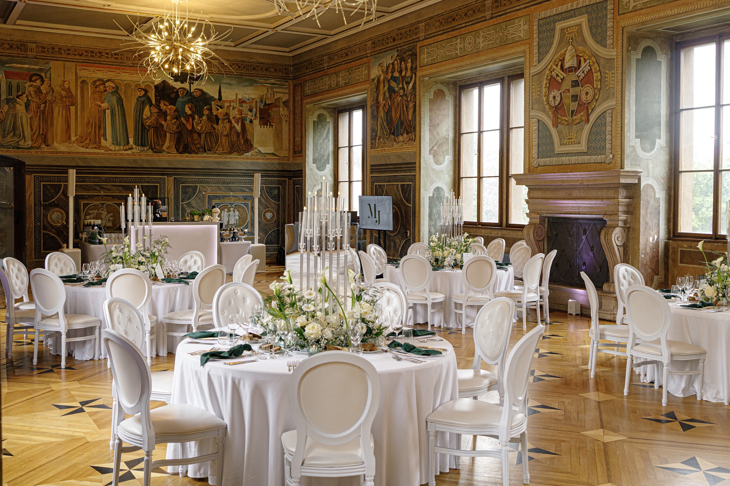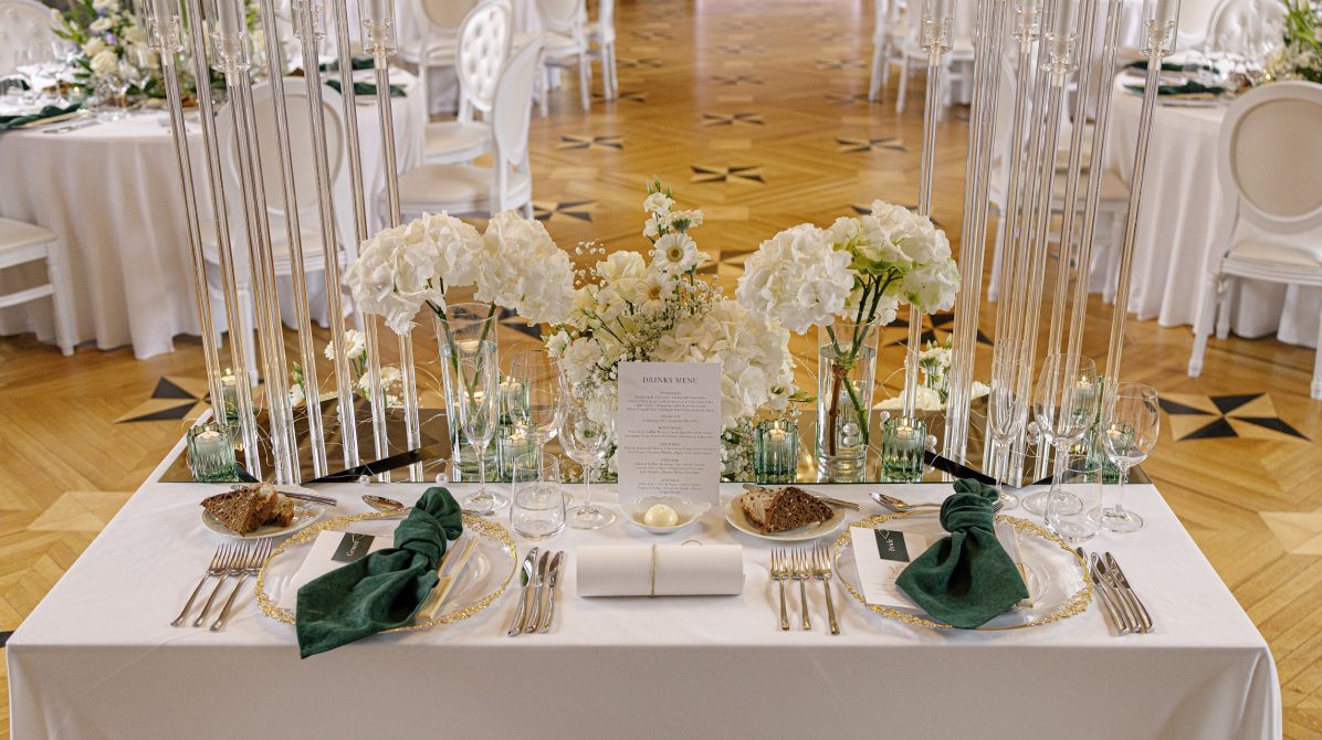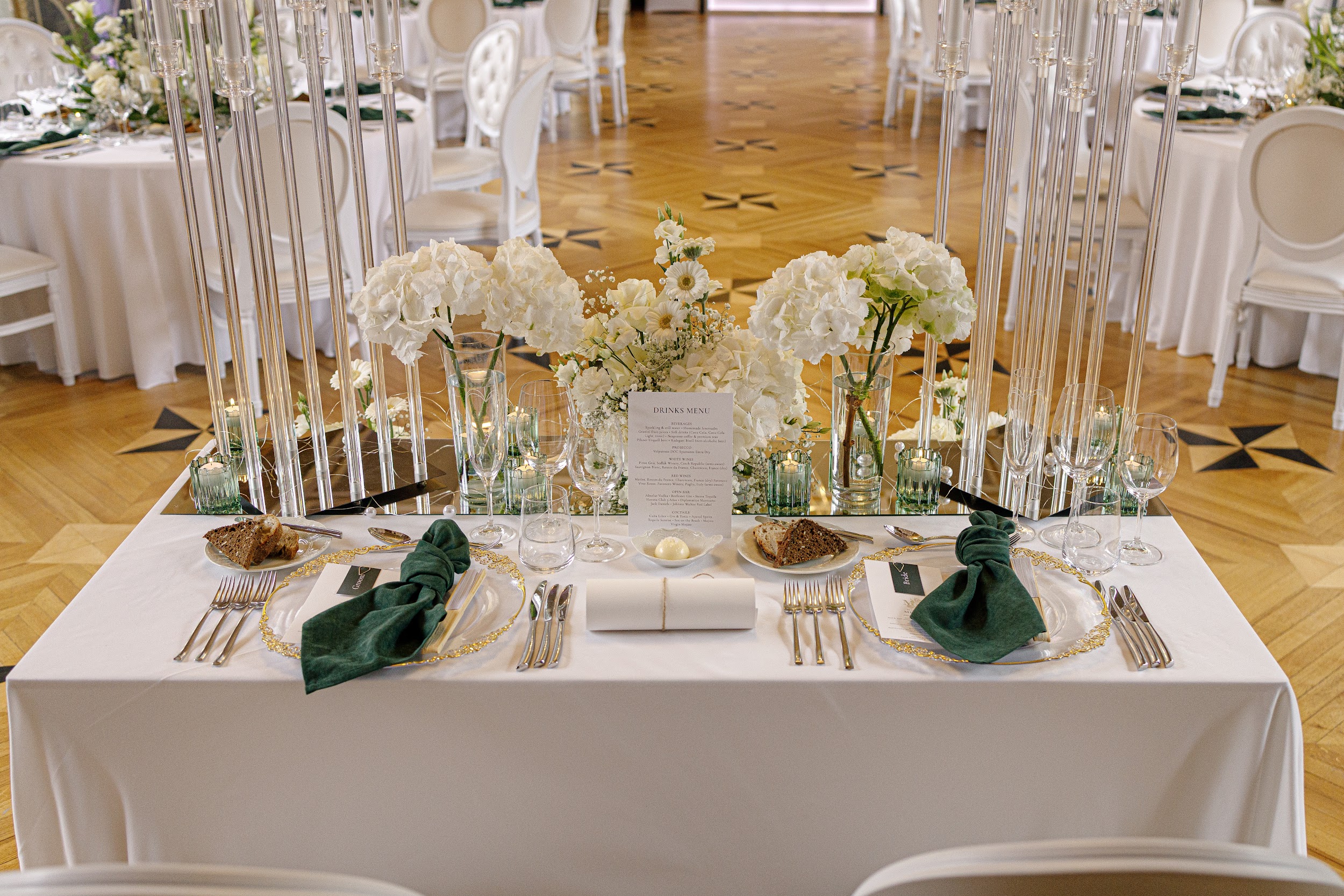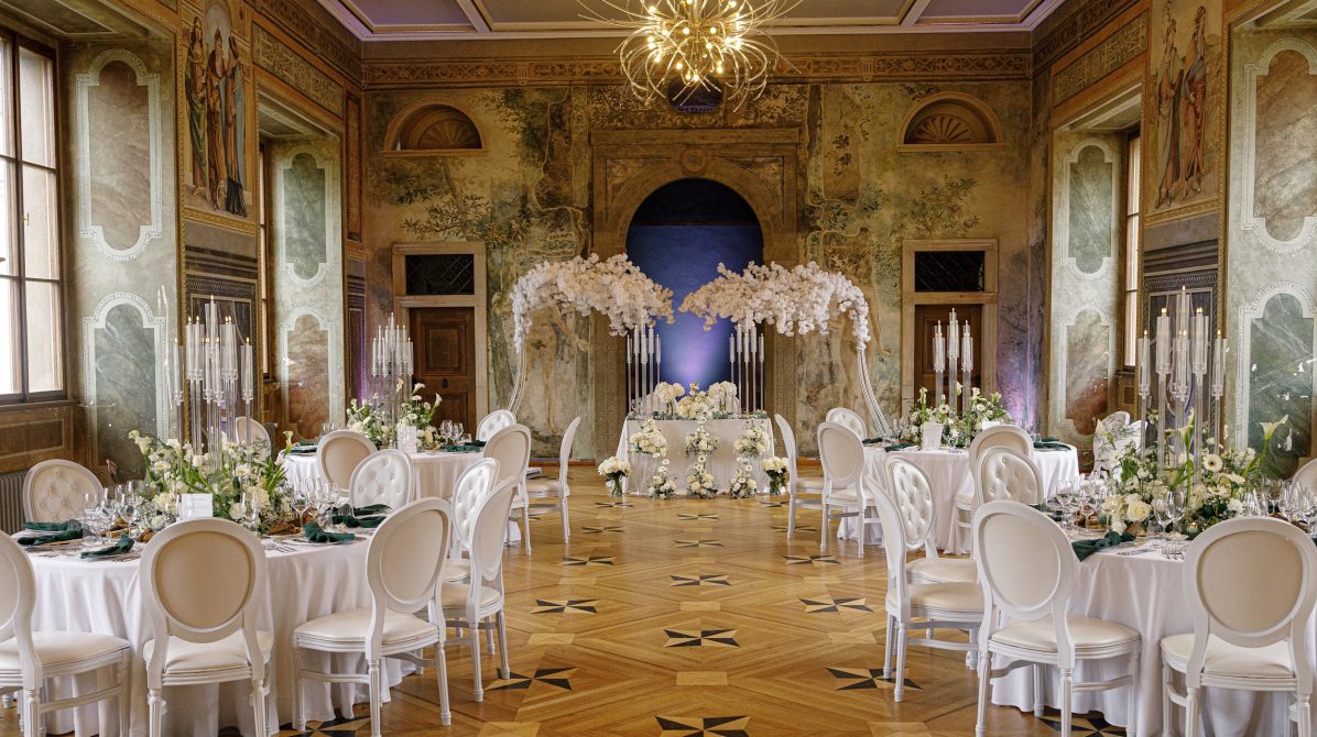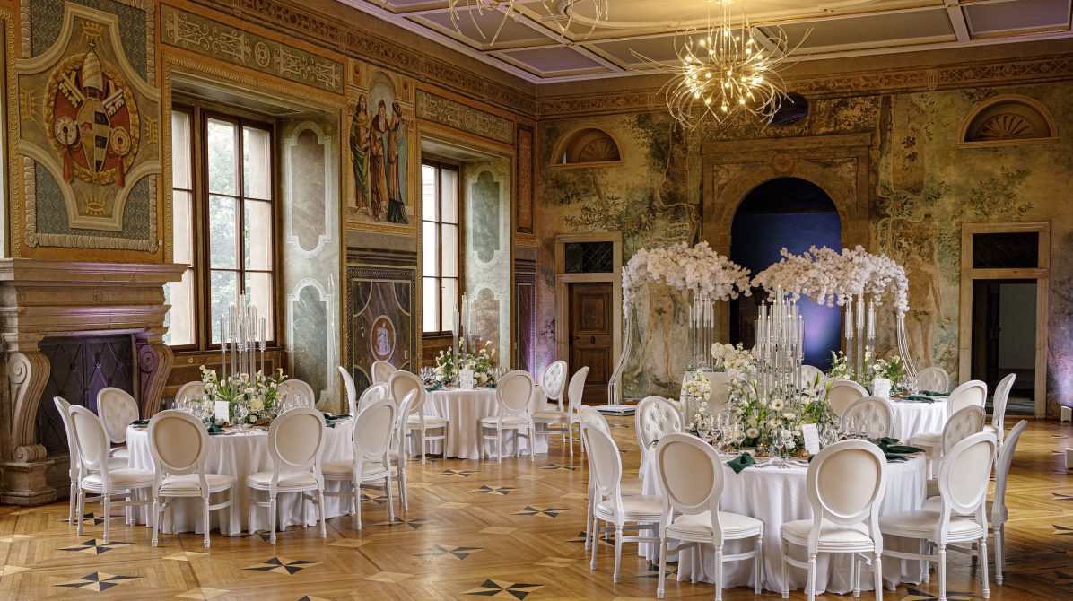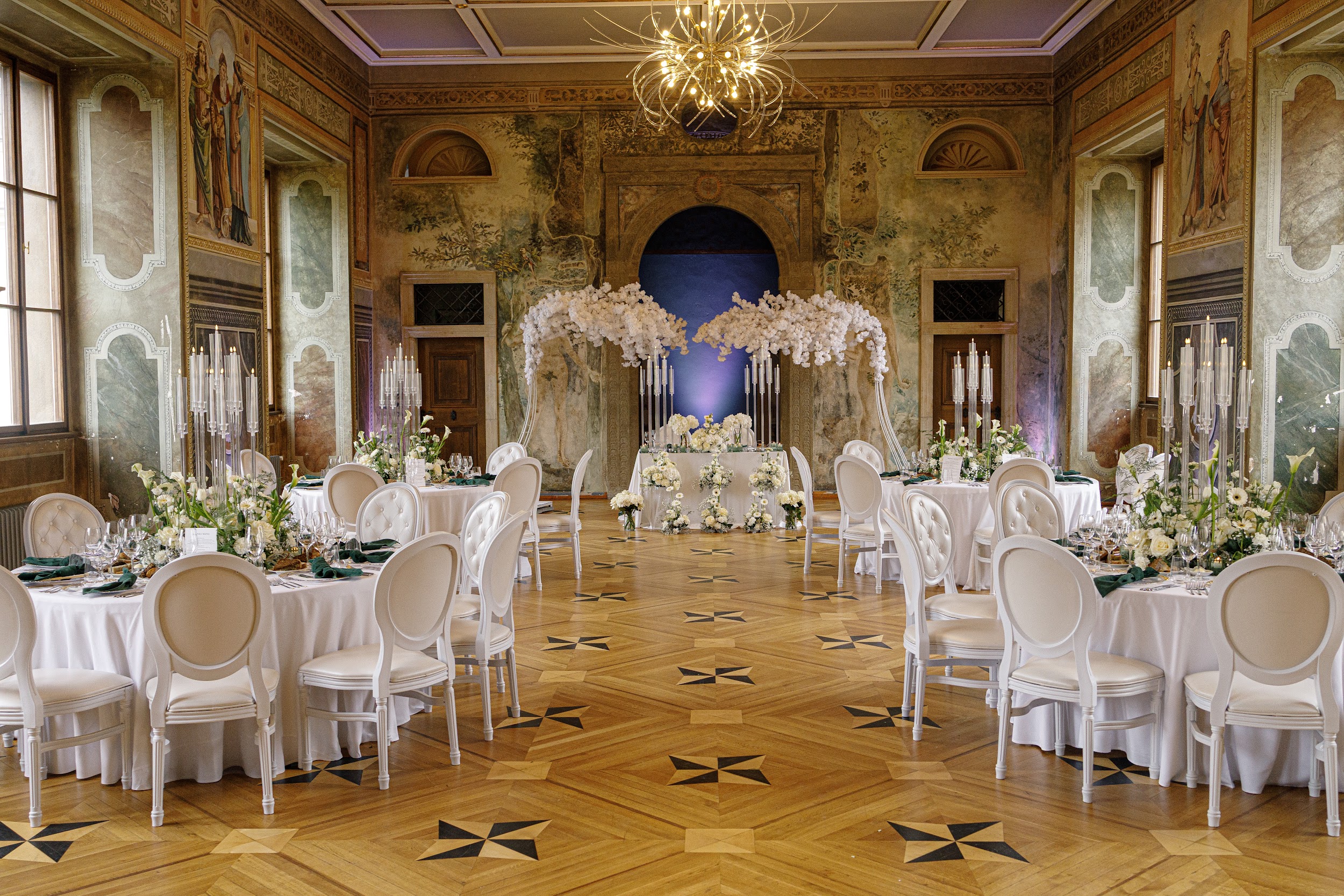 Контрастом к природной лёгкости церемонии стал банкет в Martinickém paláci — дворце с богатой историей, расписными стенами и высокими потолками. Его залы словно созданы для праздничных вечеров: изысканные фрески, тёплое освещение и ощущение, будто время замедляется. Здесь современный декор в бело-зелёной палитре и стеклянные элементы органично переплелись с архитектурным величием.