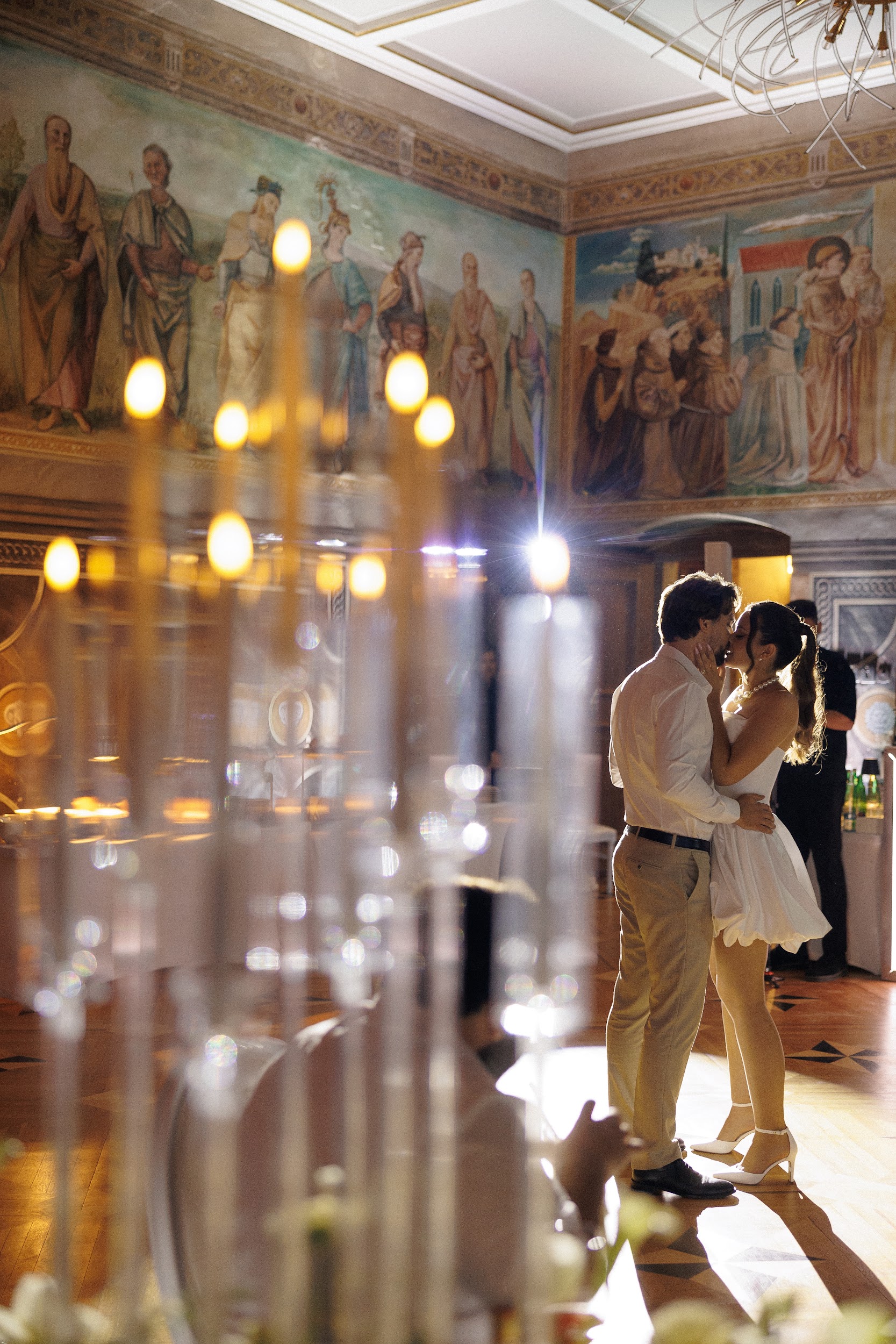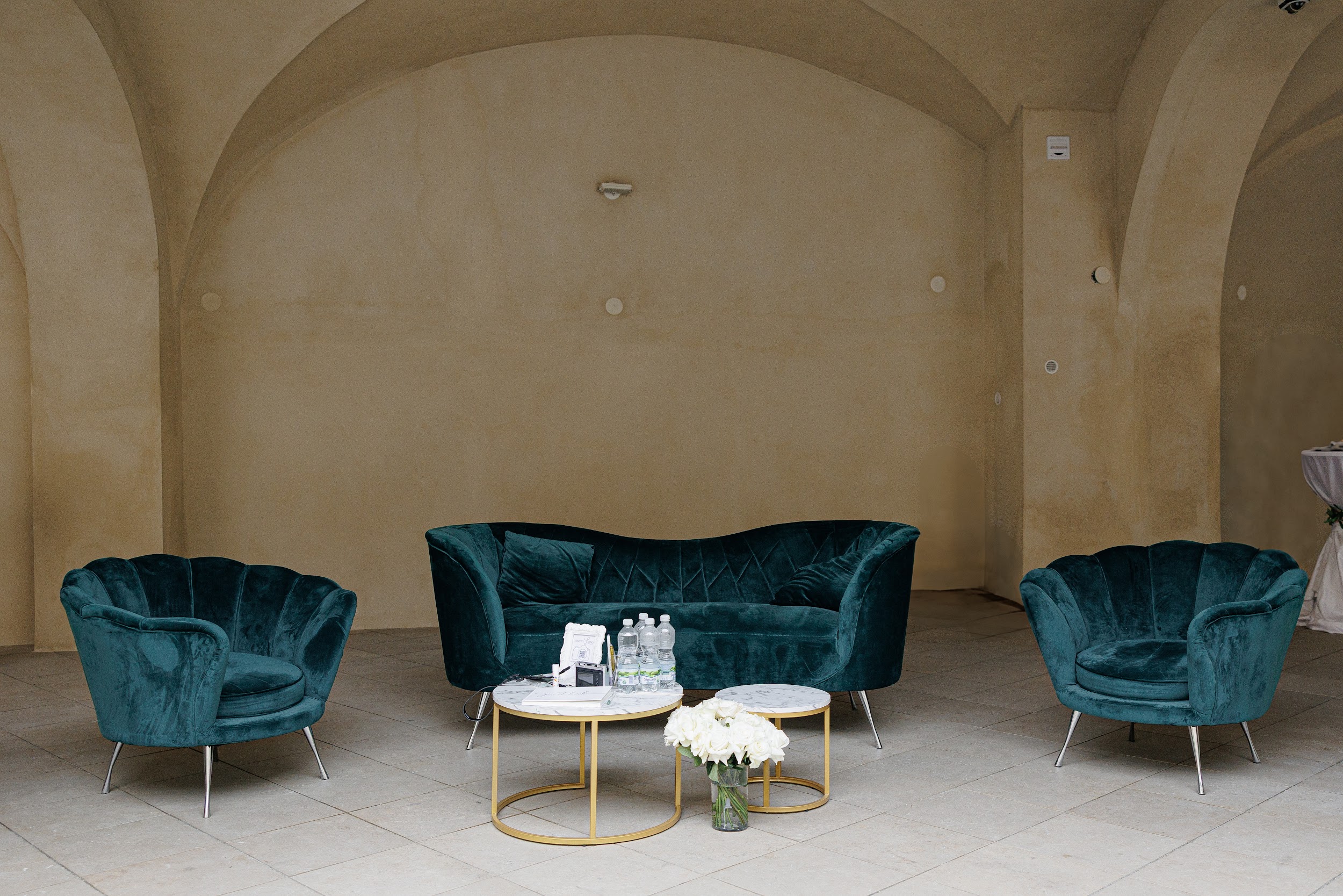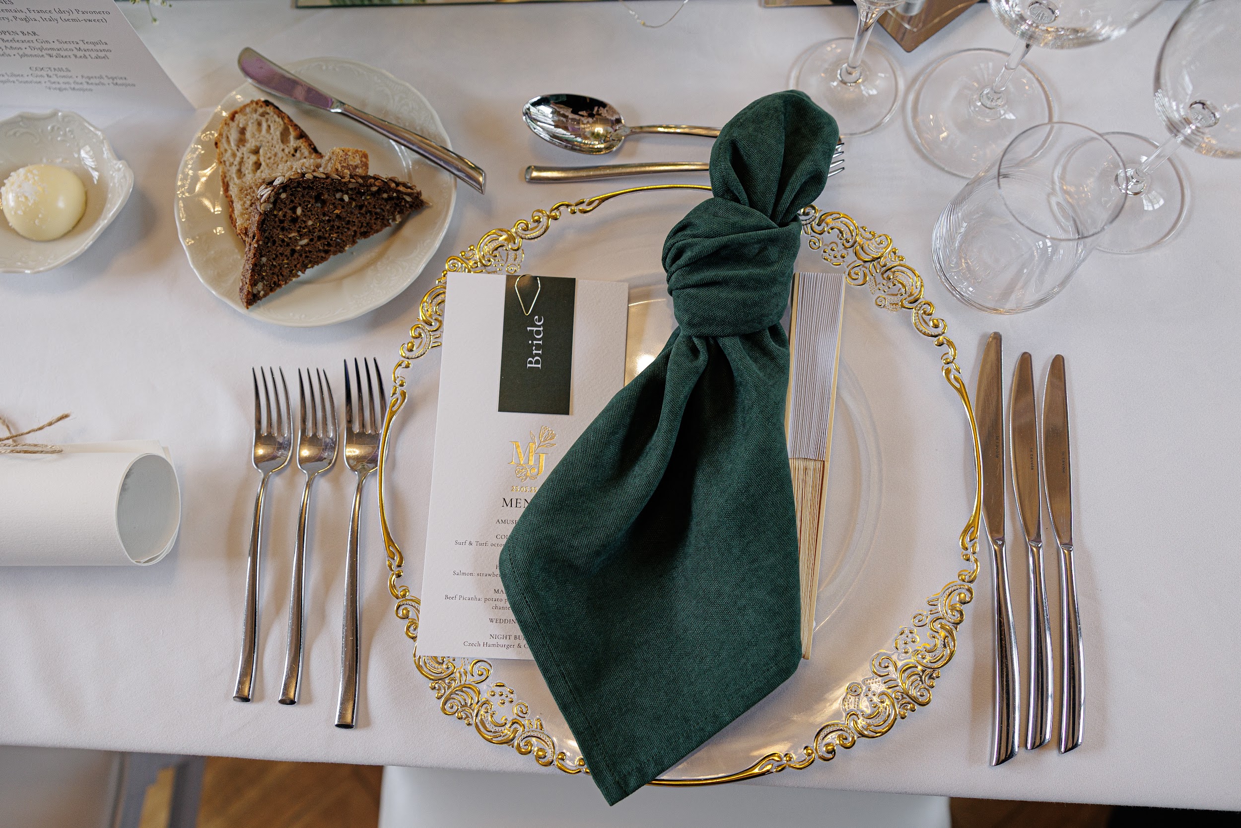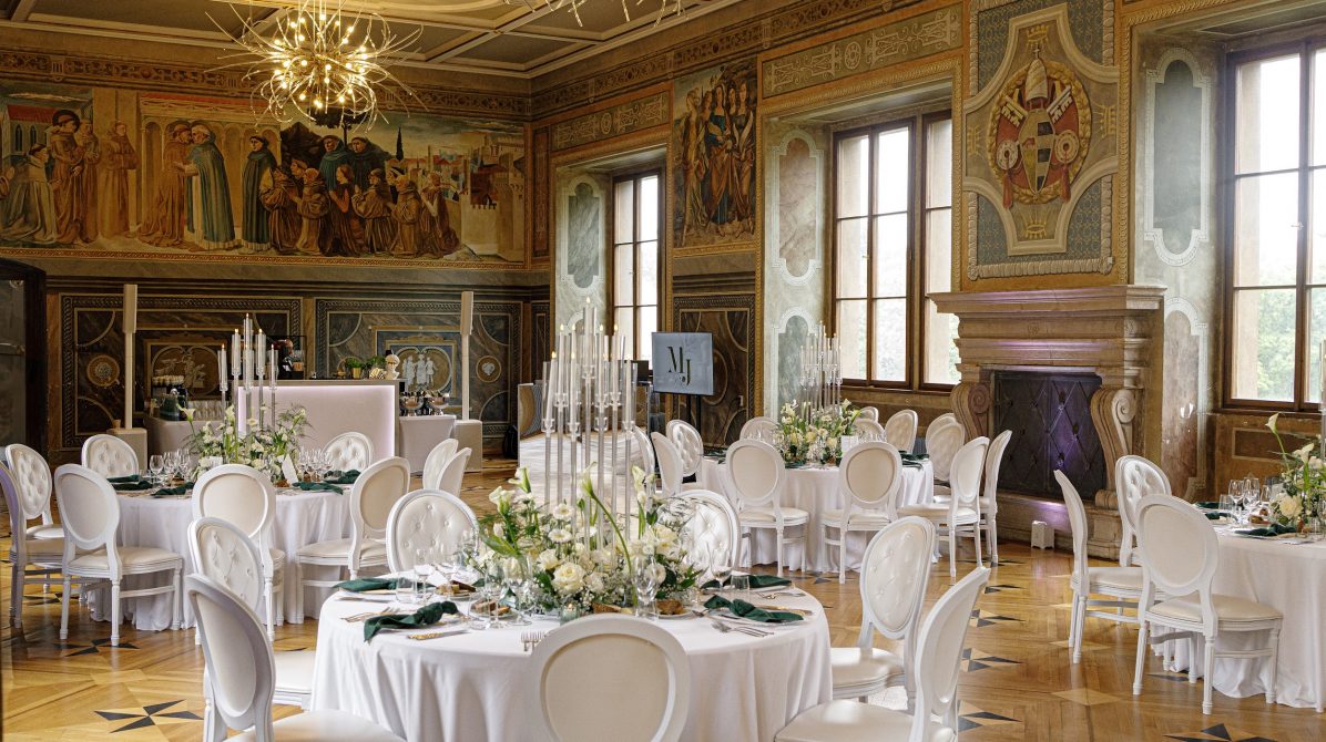 Контрастом к природной лёгкости церемонии стал банкет в Martinickém paláci — дворце с богатой историей, расписными стенами и высокими потолками. Его залы словно созданы для праздничных вечеров: изысканные фрески, тёплое освещение и ощущение, будто время замедляется. Здесь современный декор в бело-зелёной палитре и стеклянные элементы органично переплелись с архитектурным величием.