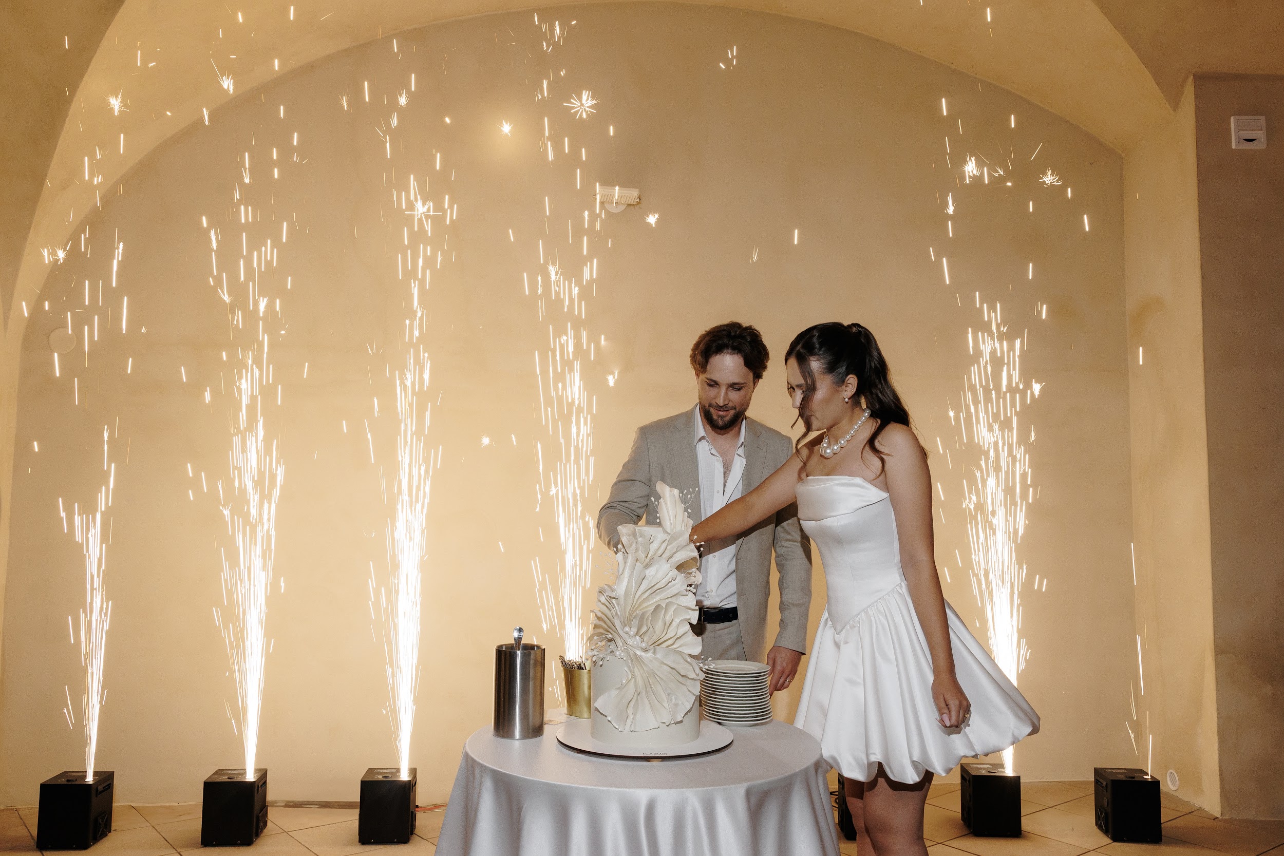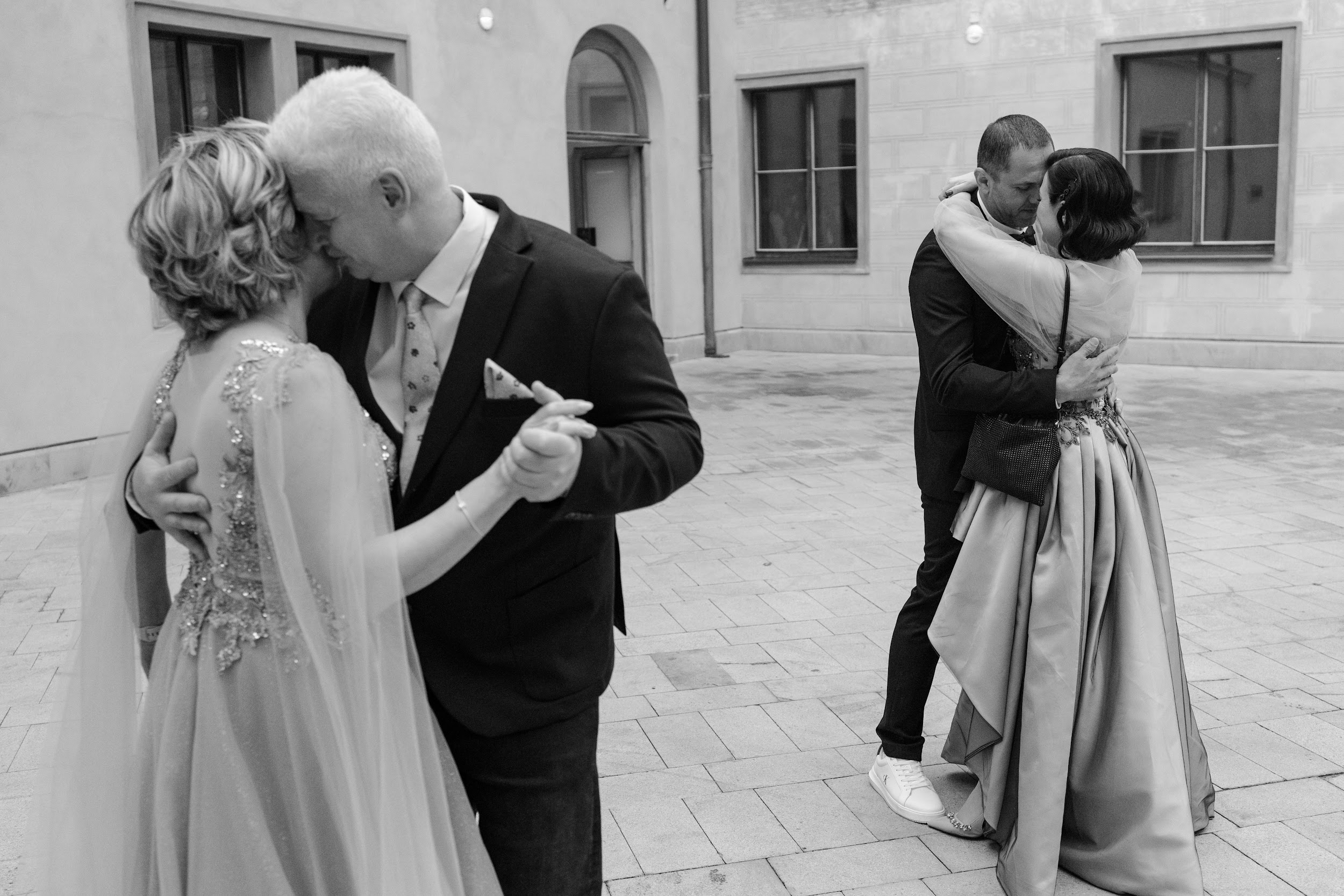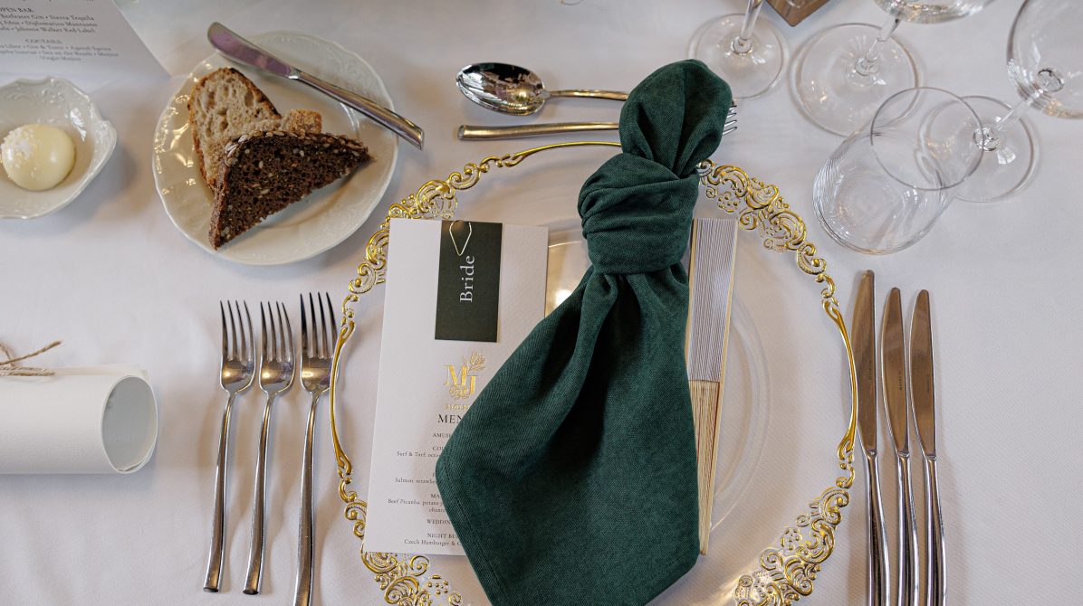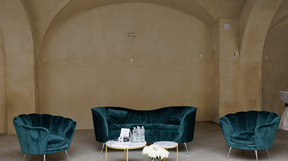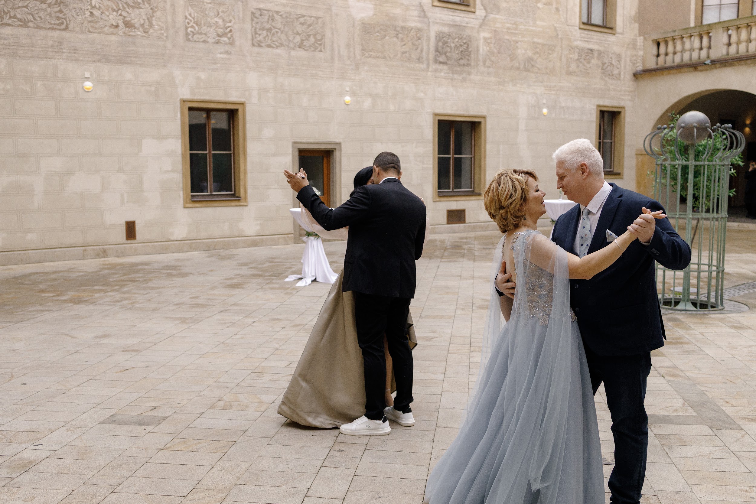Контрастом к природной лёгкости церемонии стал банкет в Martinickém paláci — дворце с богатой историей, расписными стенами и высокими потолками. Его залы словно созданы для праздничных вечеров: изысканные фрески, тёплое освещение и ощущение, будто время замедляется. Здесь современный декор в бело-зелёной палитре и стеклянные элементы органично переплелись с архитектурным величием.
