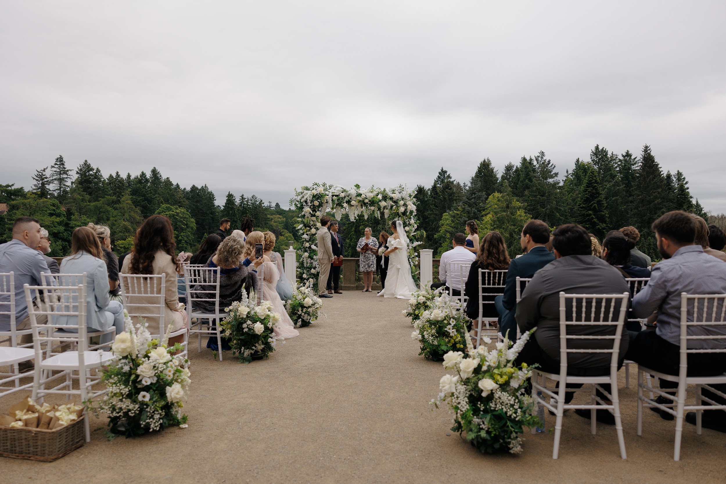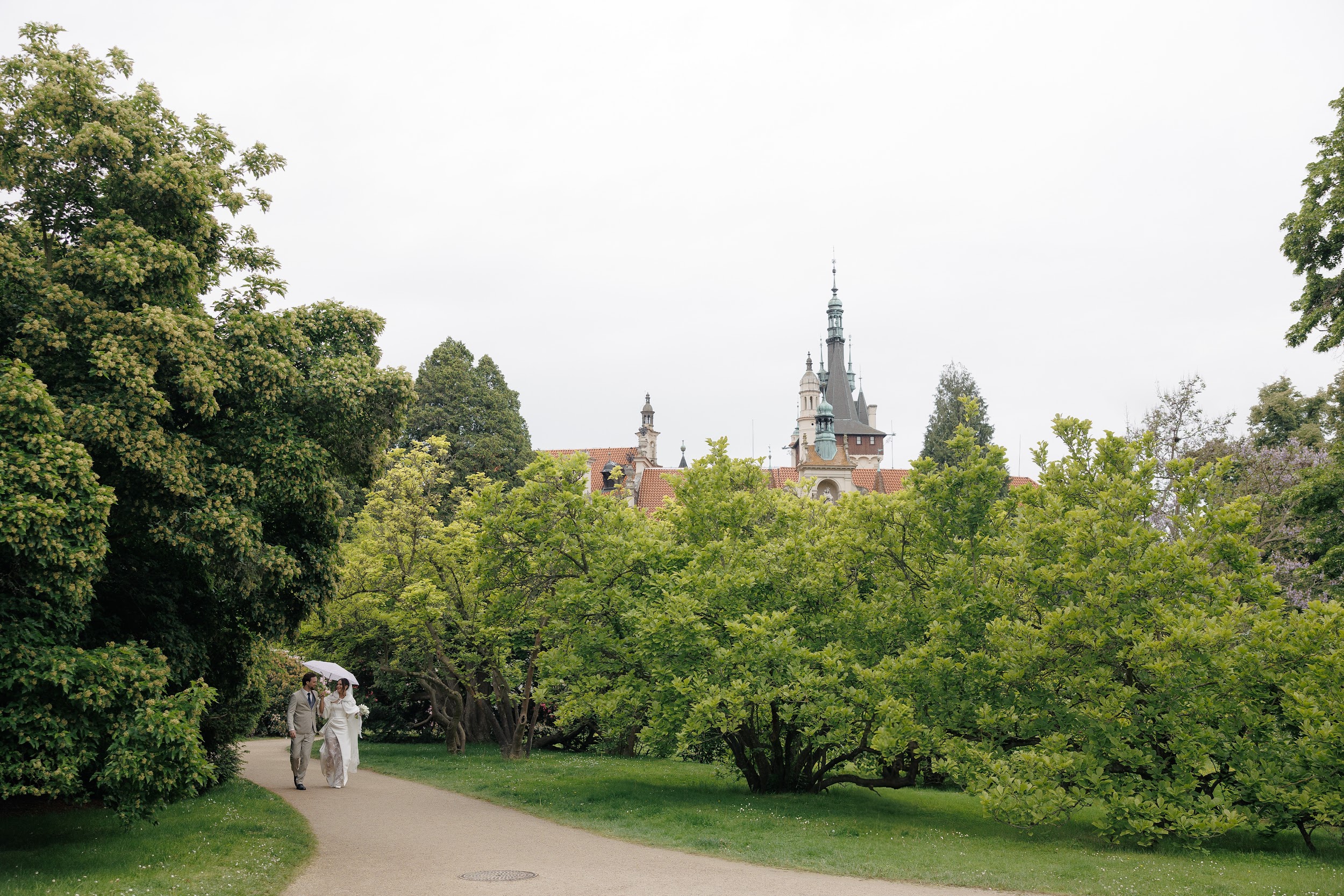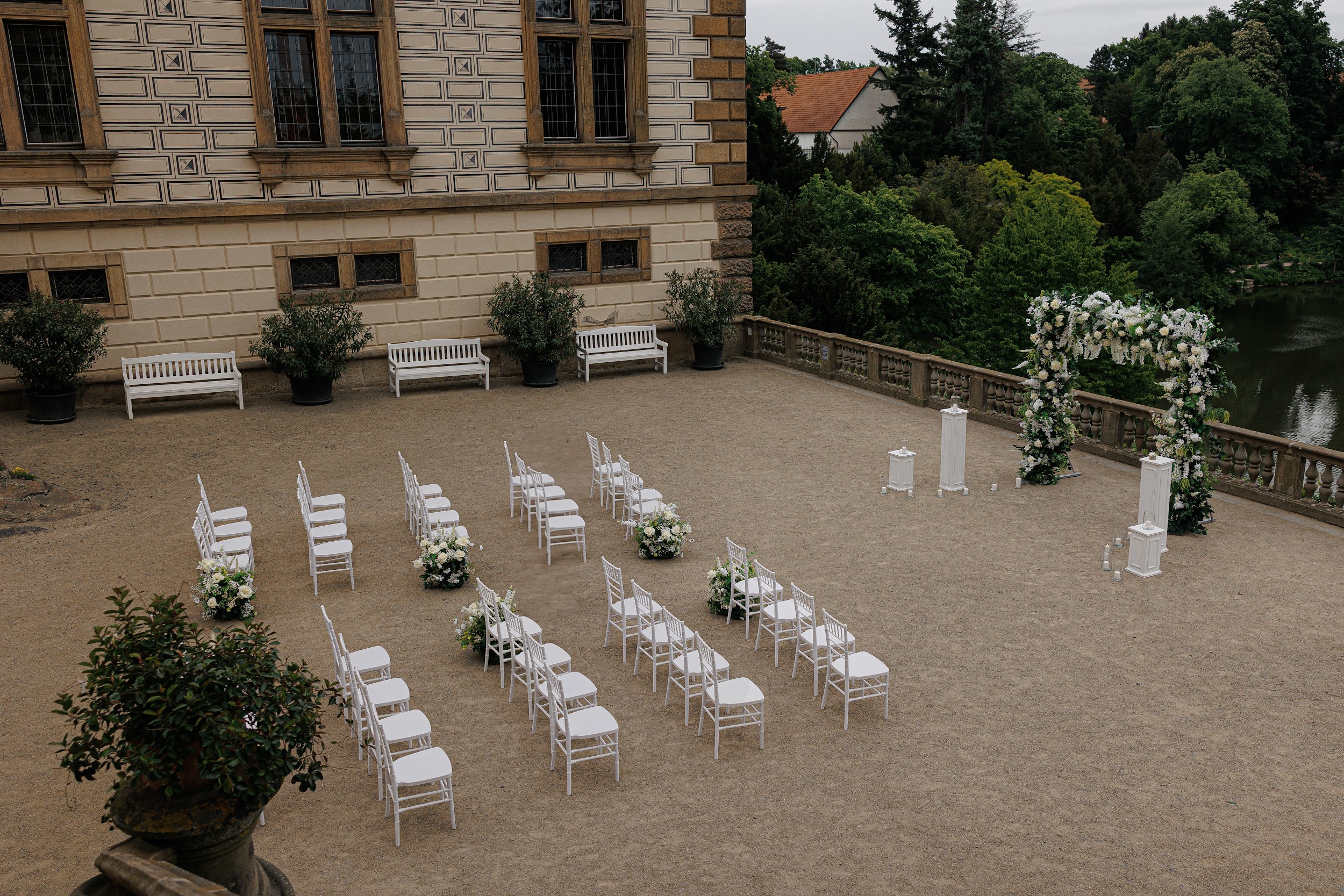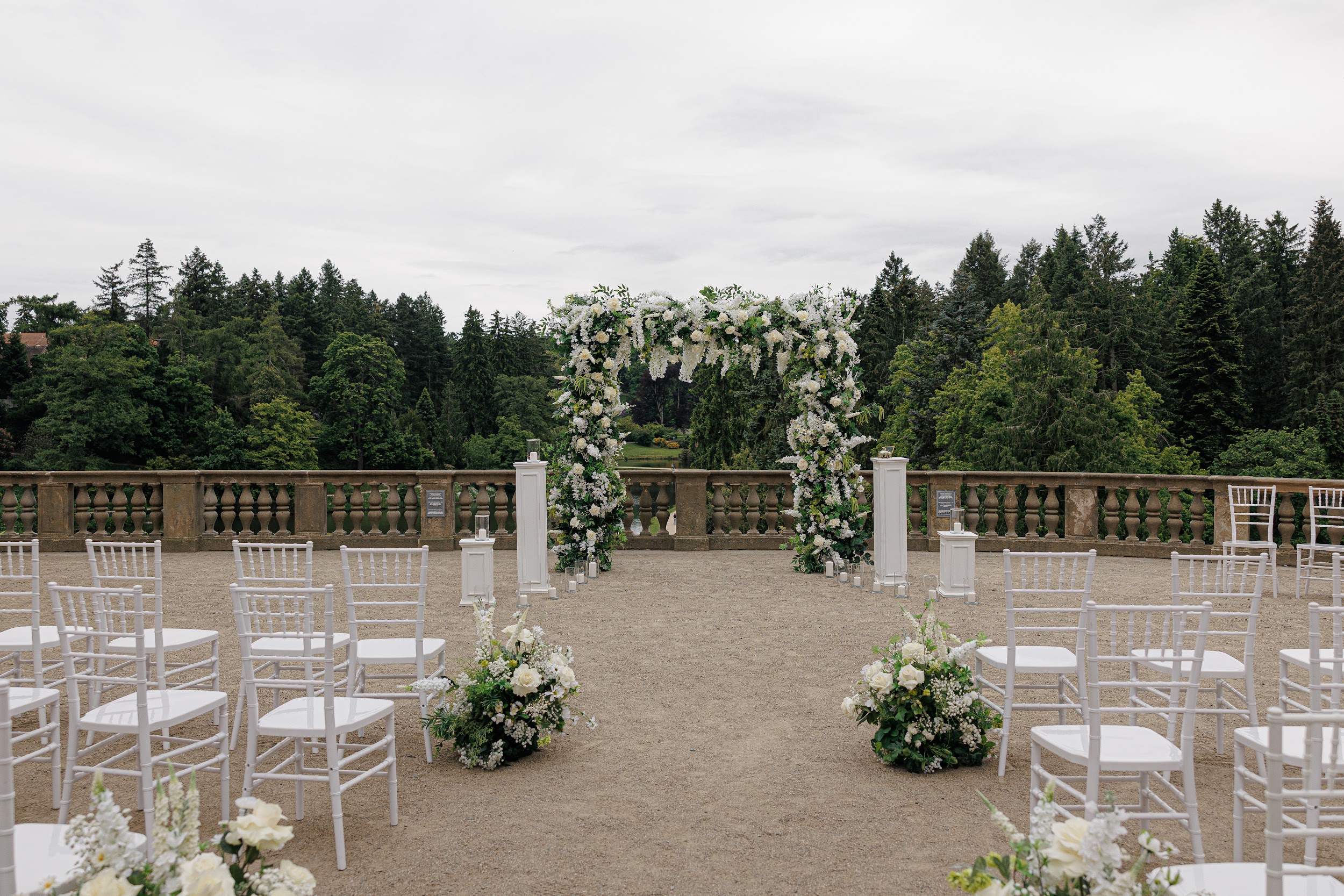 Для церемонии мы выбрали Průhonický парк — место, где просторные аллеи, старинные деревья и мягкий свет создают ощущение камерной сказки. На фоне зелени расцвела белоснежная арка, усыпанная живыми цветами, а лёгкие лепестки, рассыпанные вдоль дорожки, вели невесту к моменту, который меняет жизнь навсегда.