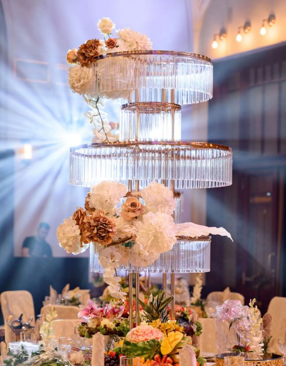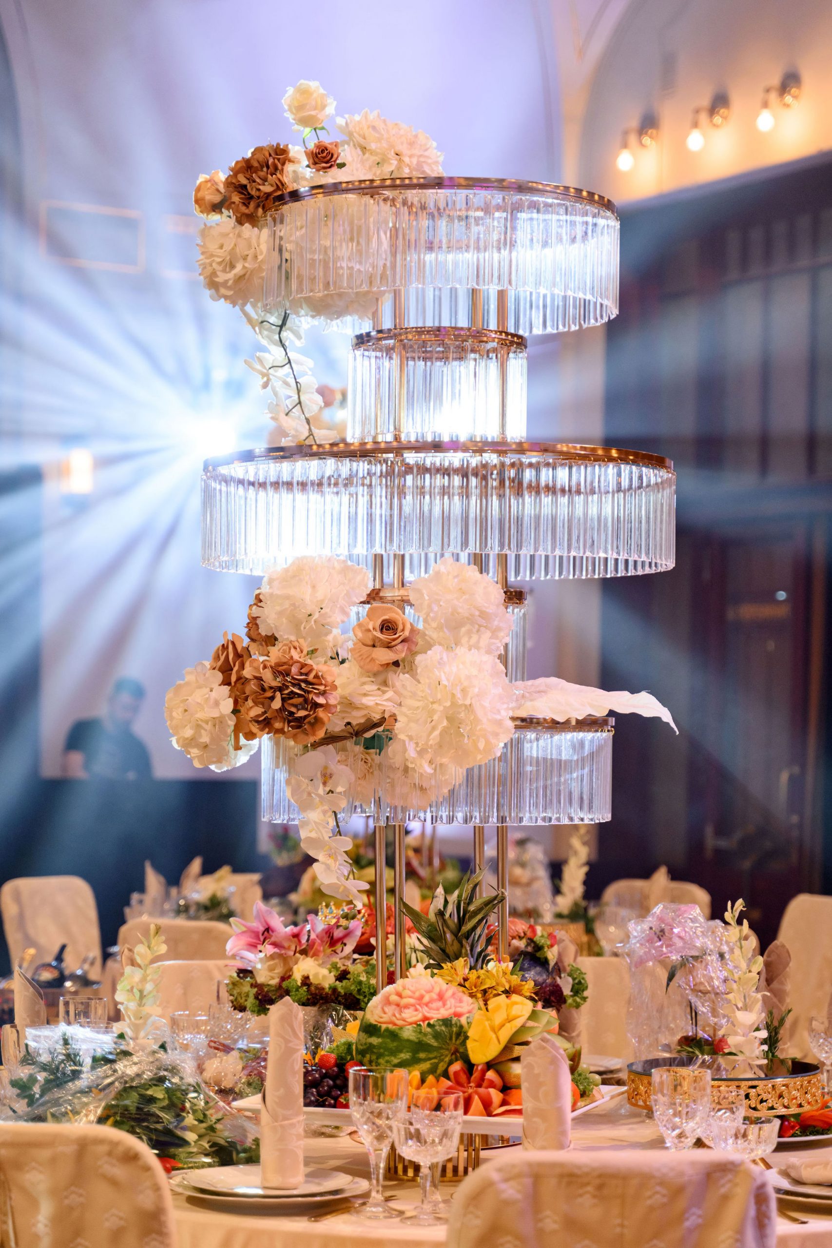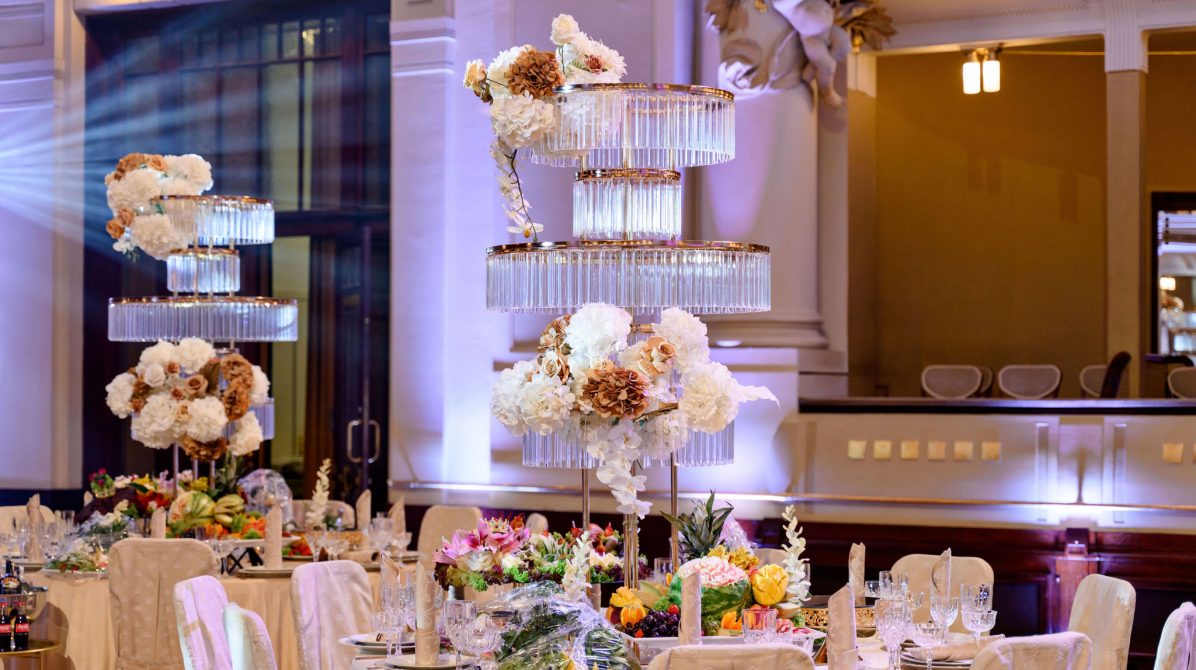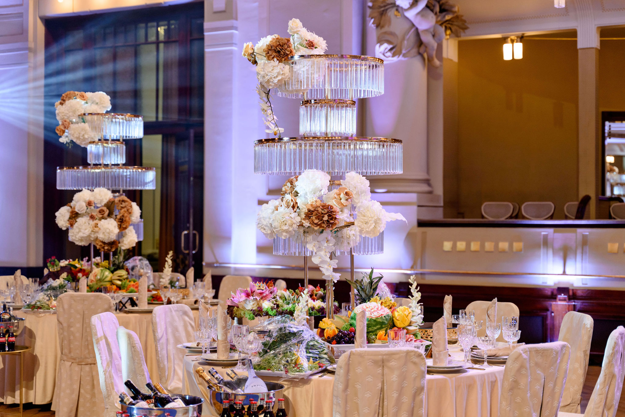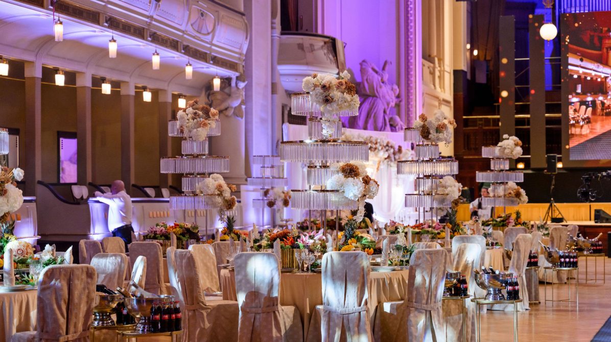 Мы воплотили невозможное: превратили концертный зал с историей в пространство, наполненное теплом, изяществом и торжественностью. Столы были украшены пышными цветочными композициями, свет мягко подчеркивал архитектурные линии, а центр зала превратился в королевскую сцену для праздника, полного музыки, тостов и эмоций