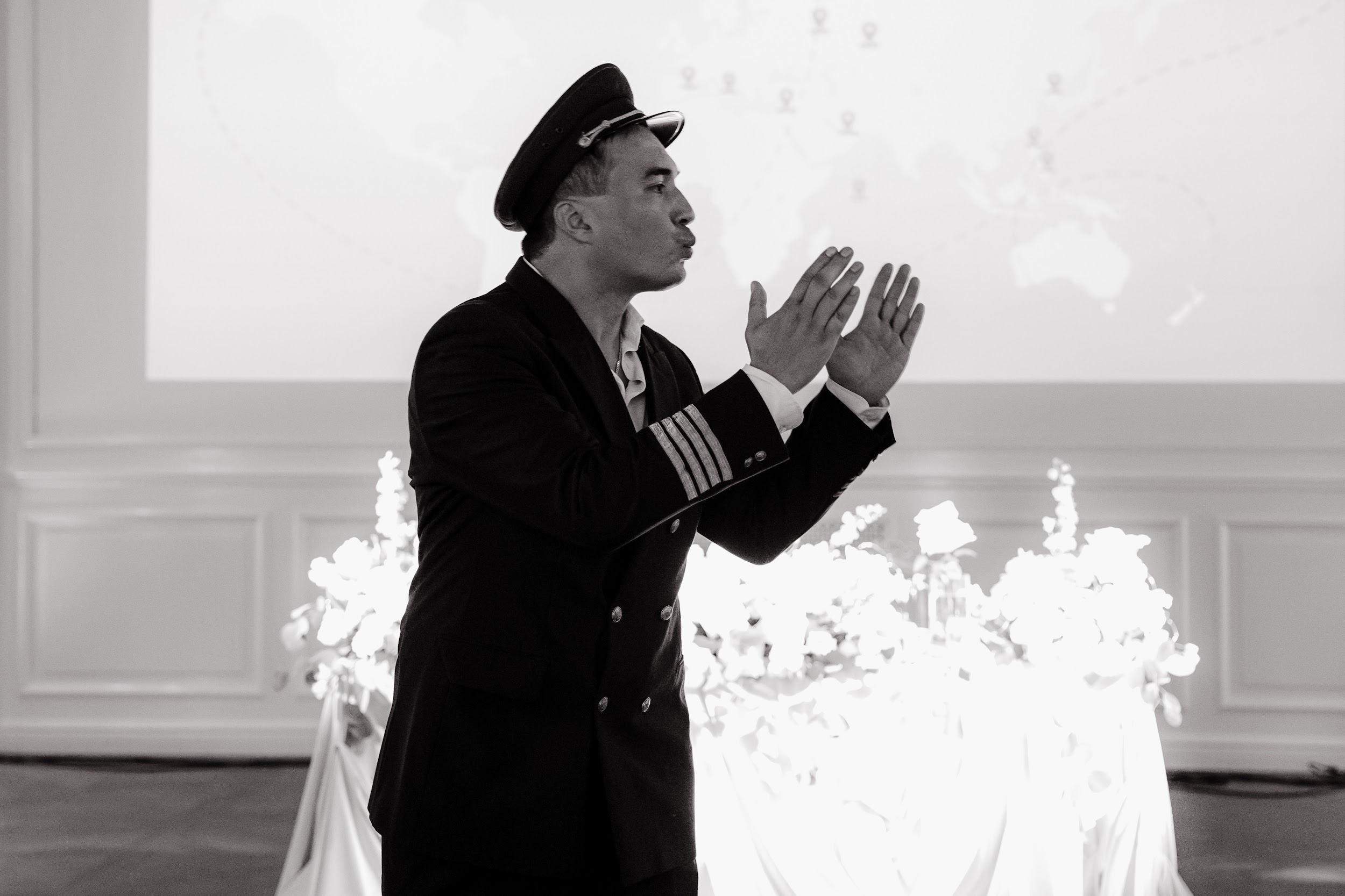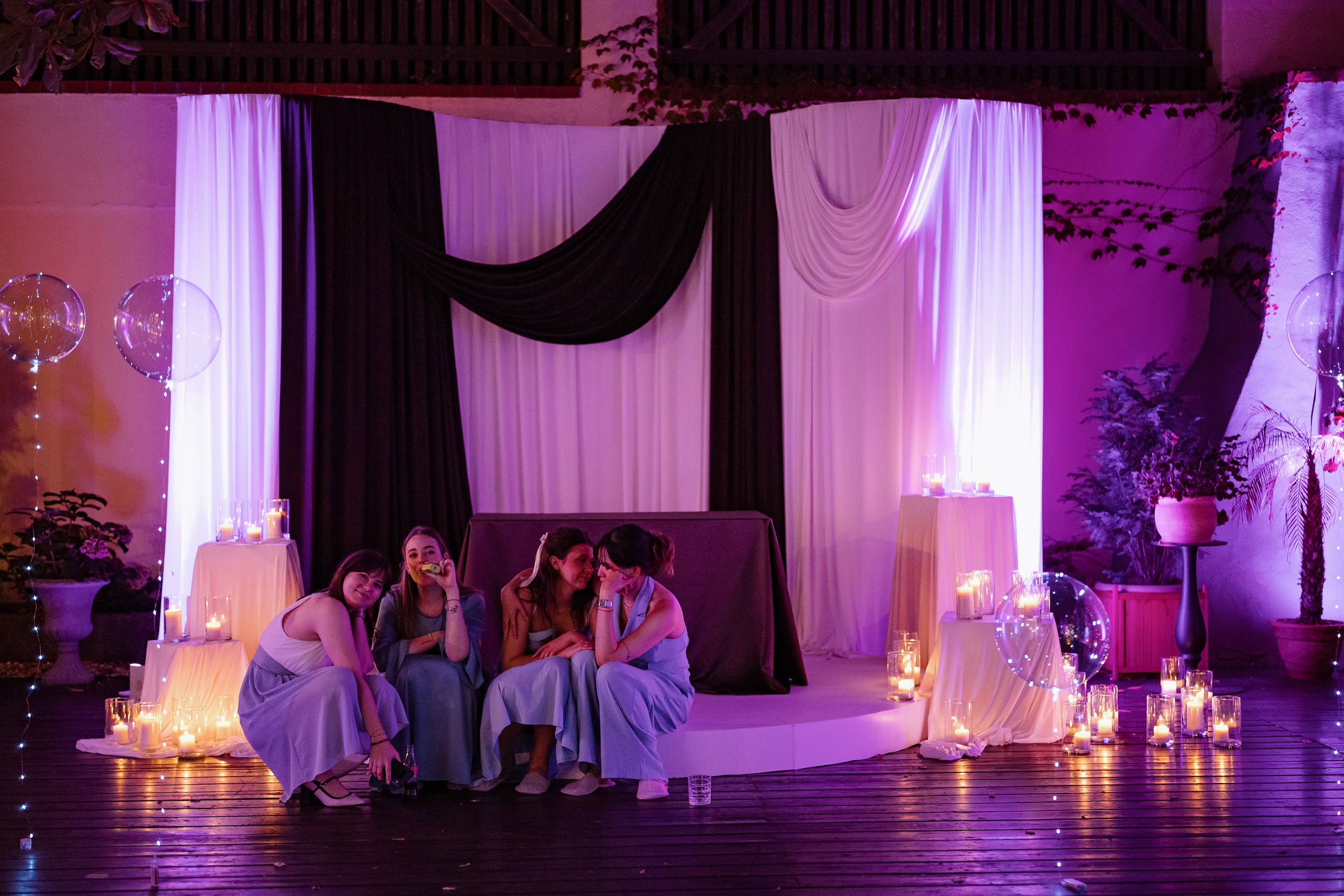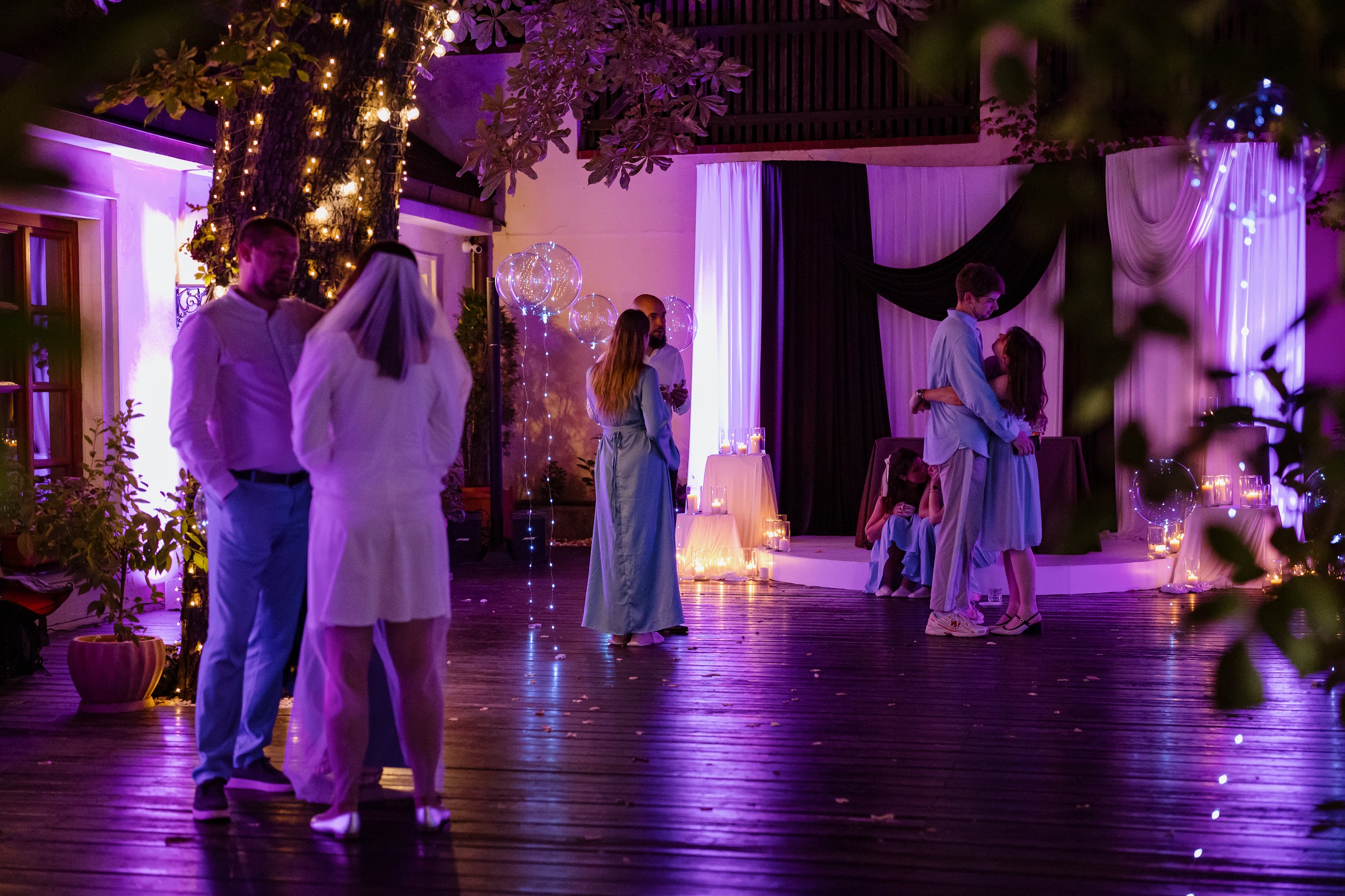 Концепция была выстроена как иммерсивная постановка: гости не наблюдали, а проживали процесс вместе с парой. Свадьба превратилась в живой театр, где пространство, музыка, свет и действия раскрывались как последовательные сцены. Наша команда стала частью истории — мы работали в образах, взаимодействовали с гостями и мягко вели их через весь вечер.