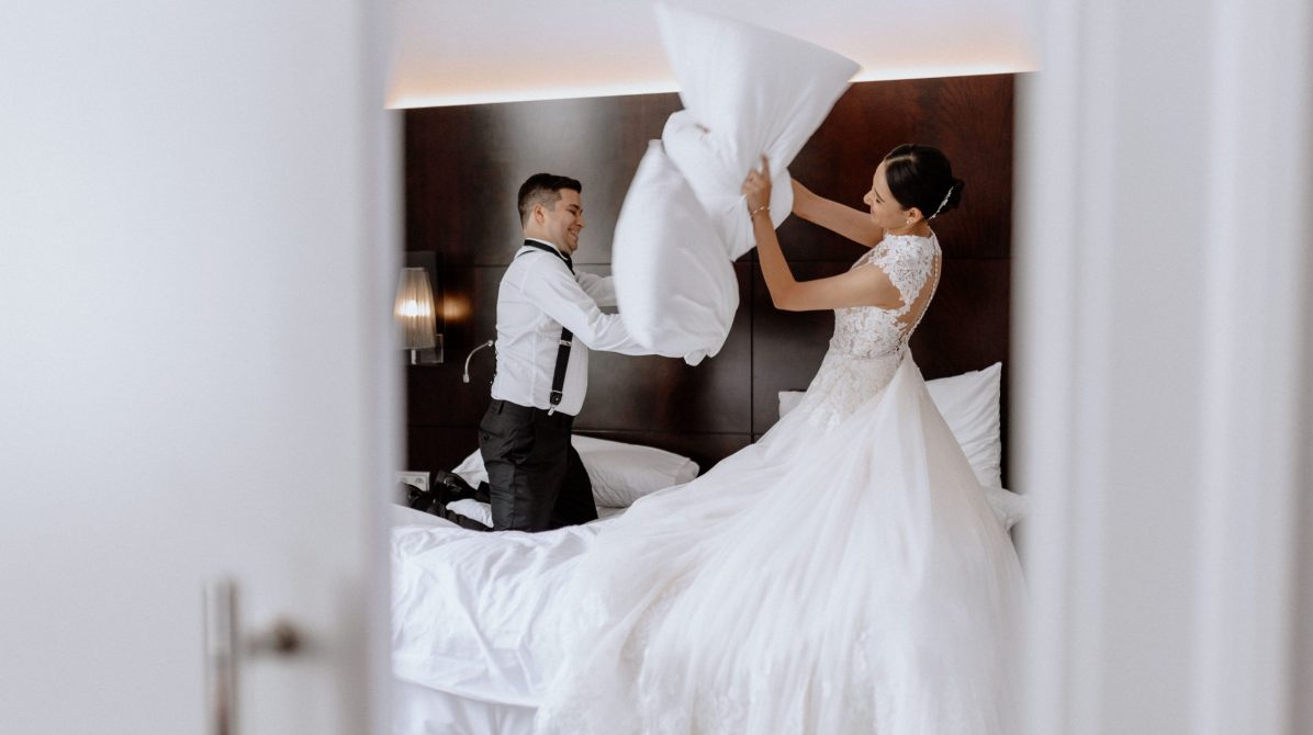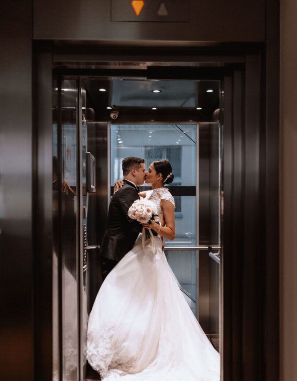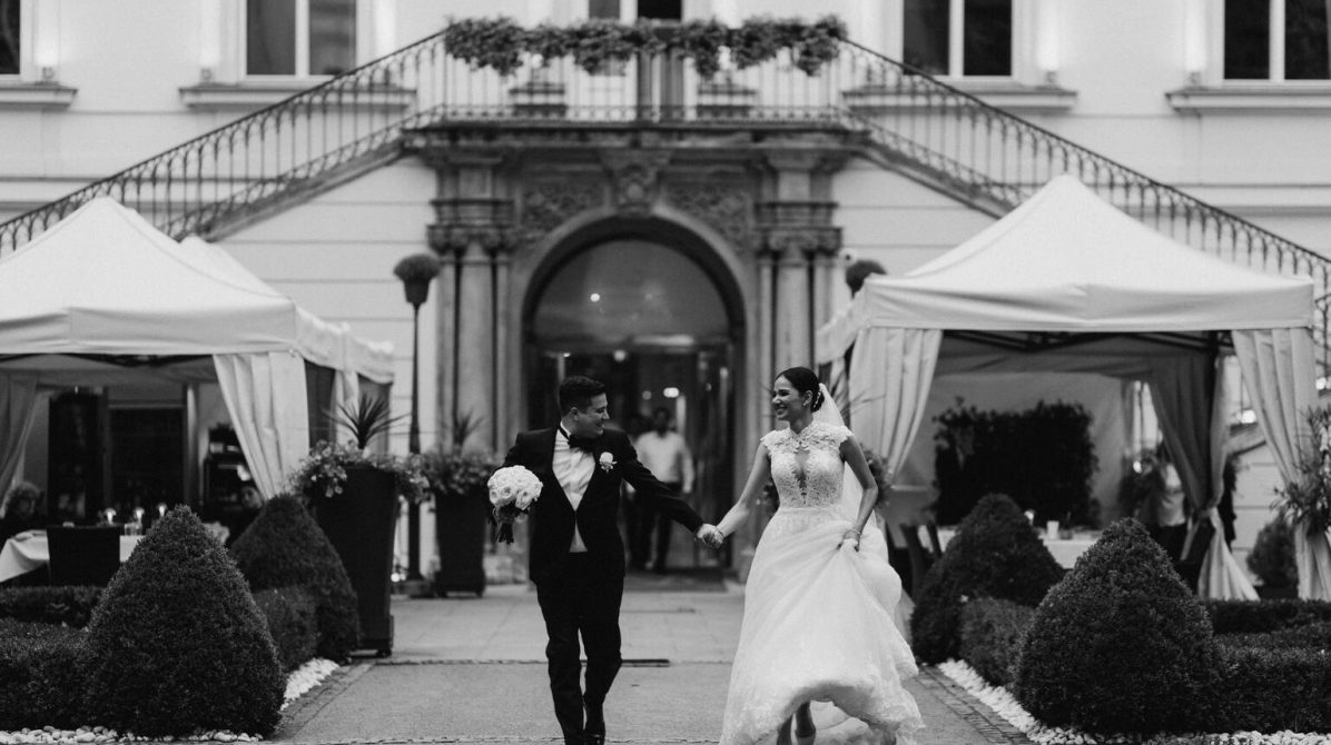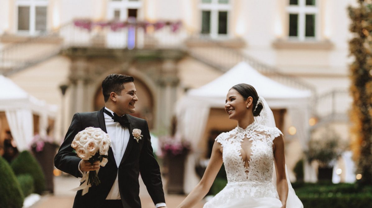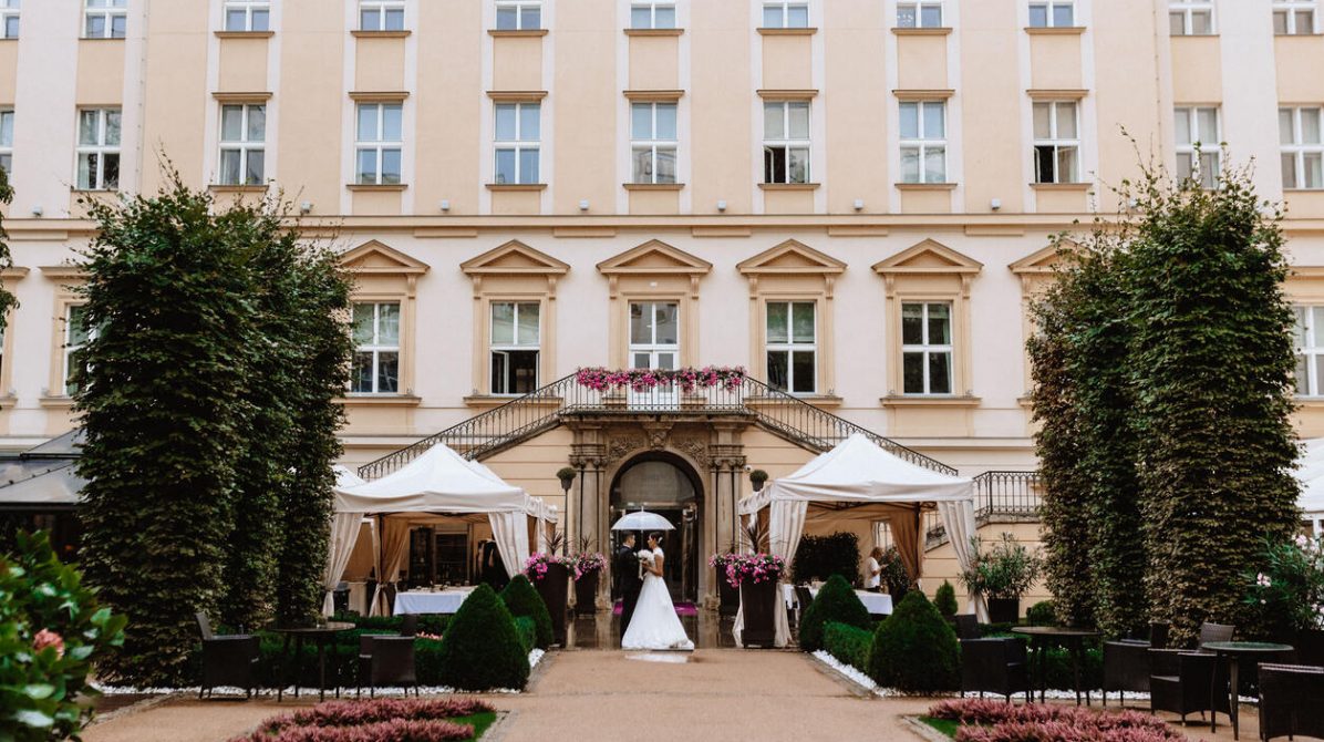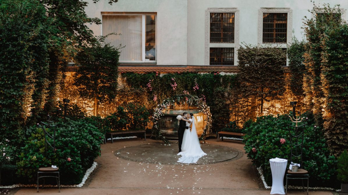 Для этой замечательной пары мы организовали свадьбу в центре Праги, в одном из самых красивых отелей — Grand Mark. По желанию невесты роспись была запланирована в саду под открытым небом в современном стиле. Однако в день свадьбы начался неожиданный ливень, который не был предсказан прогнозом. Конечно, у нашей команды был запасной план, но невеста не теряла надежды на воплощение задуманного.